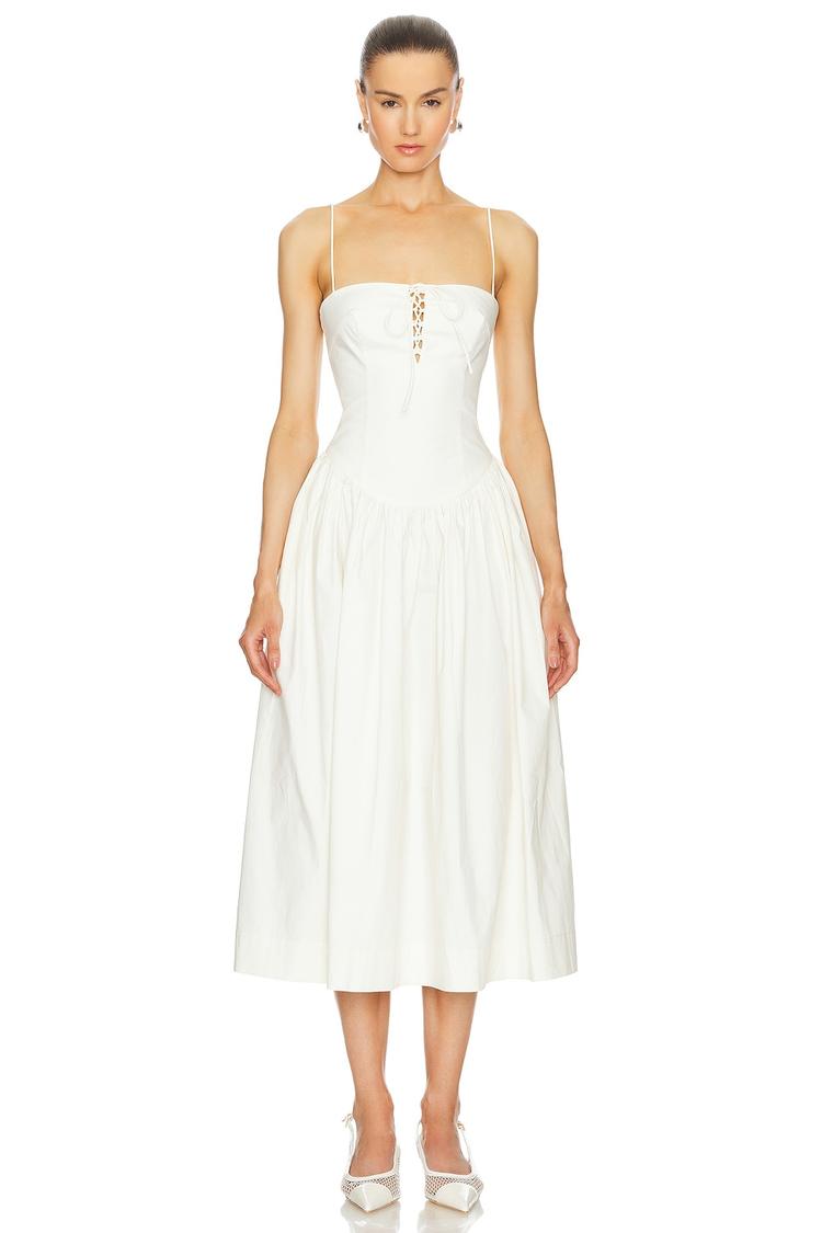 Soft cotton with a touch of elastane forms a fitted bodice featuring adjustable spaghetti straps and a straight neckline. The midi-length skirt flows gently in a classic fit and flare silhouette, perfect for warm spring and summer days. A hidden back zipper closure ensures a seamless look, while the clean hemline adds understated elegance. This white midi dress is ideal for brunches, casual outings, and vacation days, offering a romantic yet minimalist vibe that adapts effortlessly to multiple occasions.