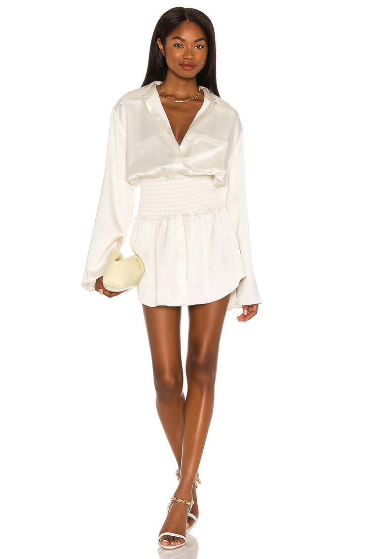 Soft matte off-white polyester fabric highlights the minimalist charm of this chic shift dress. Featuring a classic collar neckline and long regular sleeves, it offers a relaxed regular fit with a smocked waist that adds subtle texture and shape. The mini length and clean hemline create an effortlessly elegant silhouette perfect for spring and summer outings. This dress is versatile enough for casual days, brunch with friends, or romantic date nights, combining comfort and style with partial front button closure for easy wear.
