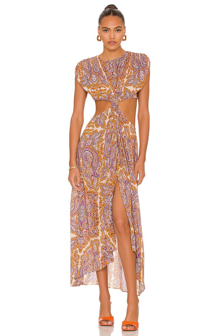 Soft viscose blend and a flowing column silhouette with an asymmetric midi hem create an effortlessly elegant look. The dress features a crew neck and sleeveless cap sleeves, with flattering waist cut-outs and a front knot detail that add modern romantic allure. Paisley patterns in muted lavender, mustard, pink, and beige enrich the fabric’s texture, while a side slit adds graceful movement. Perfect for spring and summer occasions such as brunch, date nights, cocktail parties, and vacation escapes.