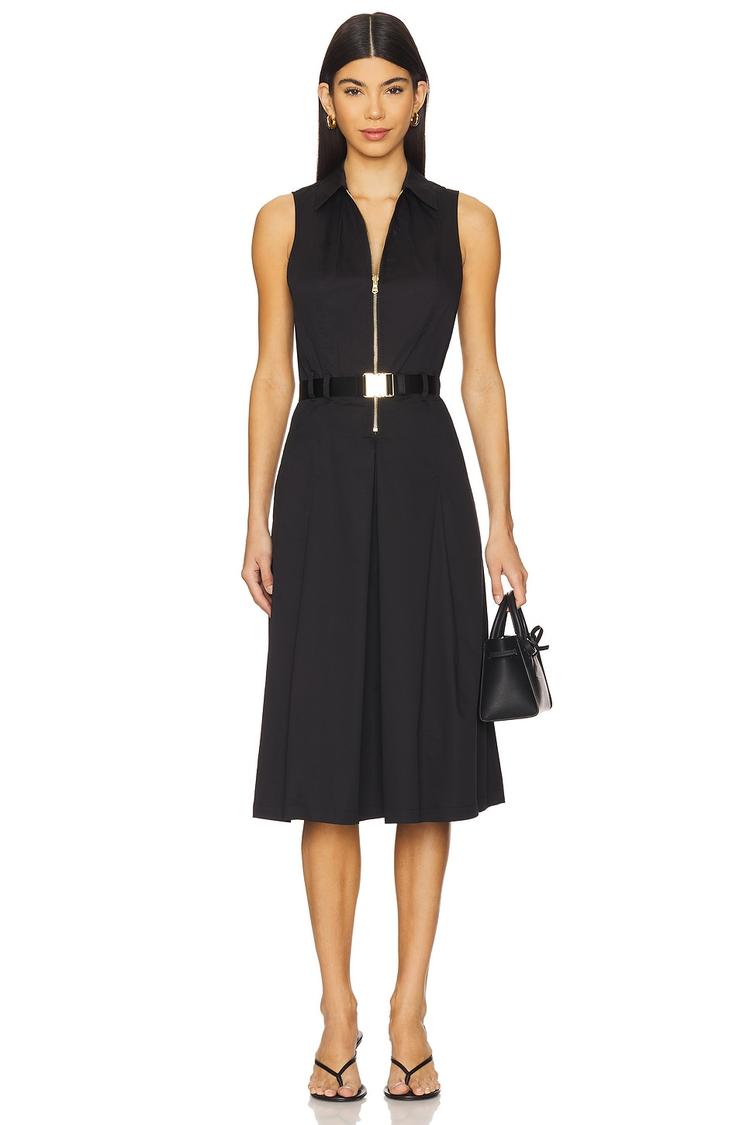 Clean lines and a sleek collar define this matte black shirt dress crafted from a midweight cotton-nylon blend with a touch of spandex for stretch. The fitted silhouette cinches at the waist with an adjustable belt featuring a striking gold-tone buckle, enhancing its elegant and minimalist appeal. Sleeveless and midi-length, it includes practical side seam pockets and a front zipper closure. This versatile dress transitions effortlessly from business casual meetings to chic brunches or refined date nights, embodying classic sophistication and modern functionality.