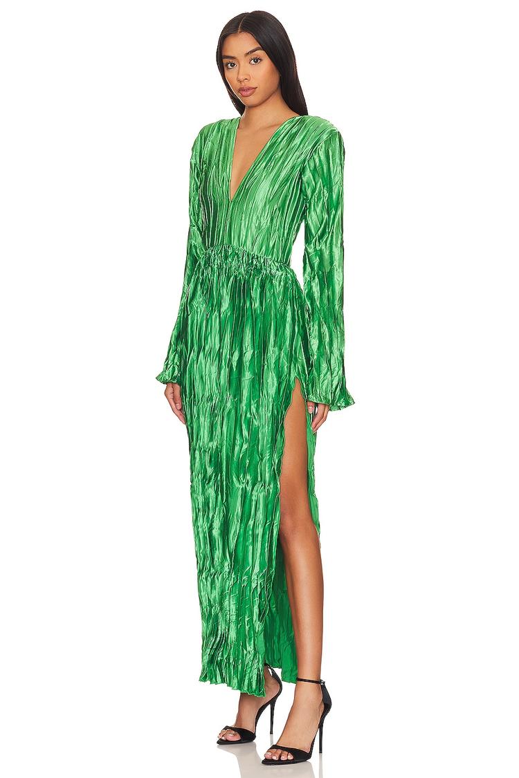 Shimmering in a vivid green satin plissé fabric, this column maxi dress features a plunging V-neck and long sleeves for a sleek, sophisticated silhouette. The slim fit and subtle draping add elegance, complemented by a daring open back with an adjustable strap and a side slit that enhances movement. Perfect for cocktail parties, night outs, or romantic date nights, this dress blends modern style with timeless elegance. The hidden back zipper and padded shoulders ensure a flawless fit, making it a versatile piece for all-season wear.
