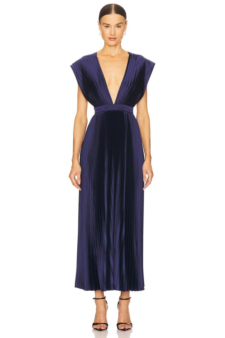 Luxurious satin plissé fabric defines this elegant column gown in a deep midnight blue. The midi length and flowy fit complement the plunging neckline and wide straps, creating a sophisticated silhouette perfect for formal galas and cocktail events. A concealed back zipper and adjustable tie-back strap ensure a flawless fit, while the all-over pleats add texture and movement. Ideal for evening occasions, this gown balances classic refinement with modern allure, making it a standout choice for your next special event.