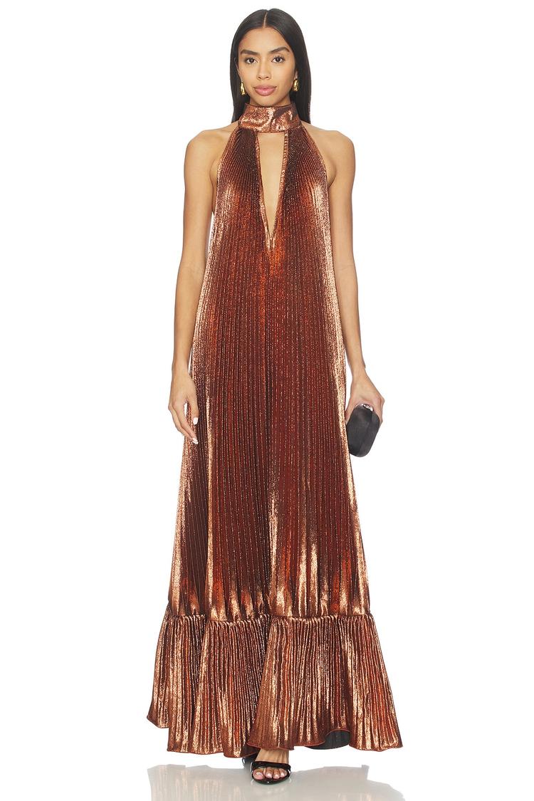 Shimmering metallic bronze hues and delicate accordion pleats define this elegant column gown. Featuring a high neckline with a button loop closure and sleeveless silhouette, the flowy maxi length cascades into a ruffled hem that adds subtle movement. Crafted from a woven polyester-viscose blend with metallic threads, this sophisticated gown is perfect for cocktail parties, formal events, and galas. Its unlined, pull-on style ensures comfort while making a striking statement with its unique texture and refined design details.