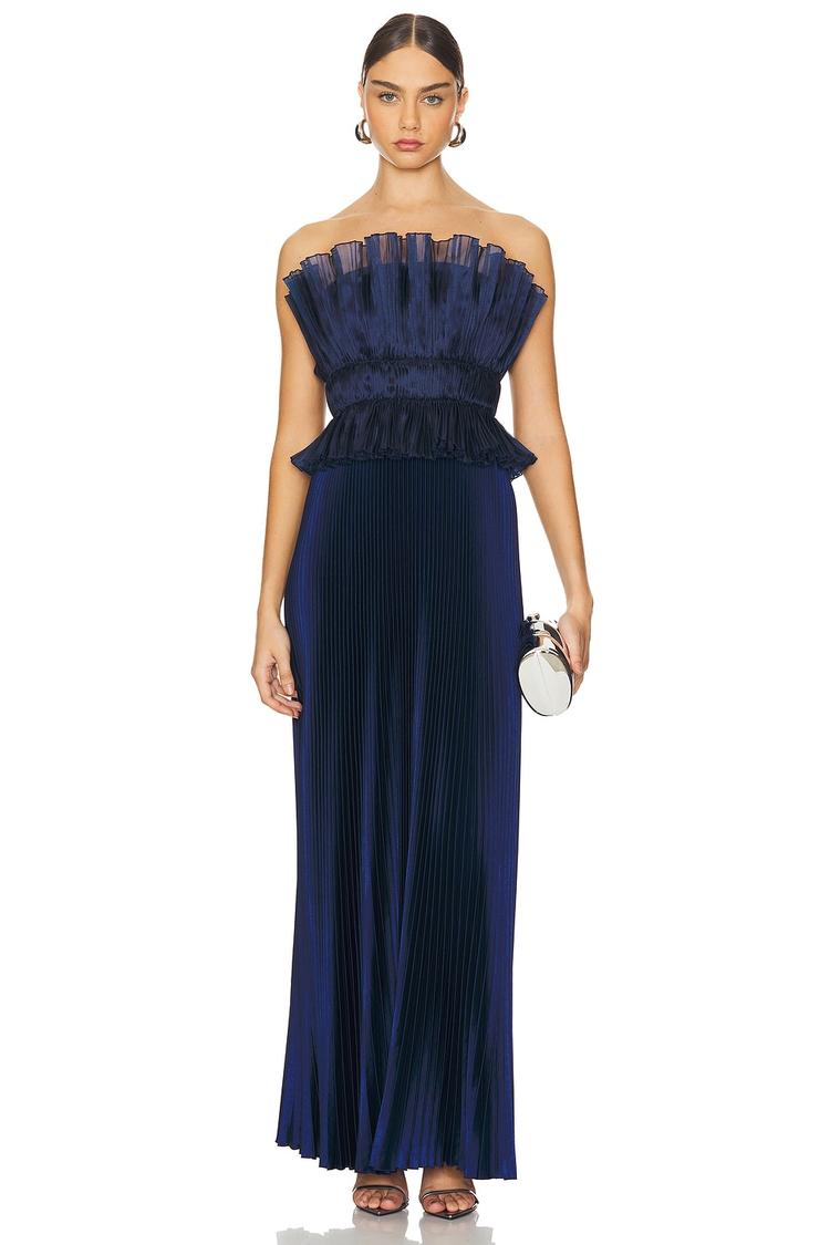 Soft pleated satin in a deep dark blue hues sets a refined tone for this slim-fitting column gown. The strapless straight neckline is enhanced with delicate tulle and ruffle details along the bodice, adding texture and elegance. A concealed back zipper ensures a smooth silhouette while the maxi length with a clean hemline completes the sophisticated look. Ideal for gala evenings, formal events, or cocktail parties, this elegant satin gown balances graceful design with comfortable wearability across seasons.