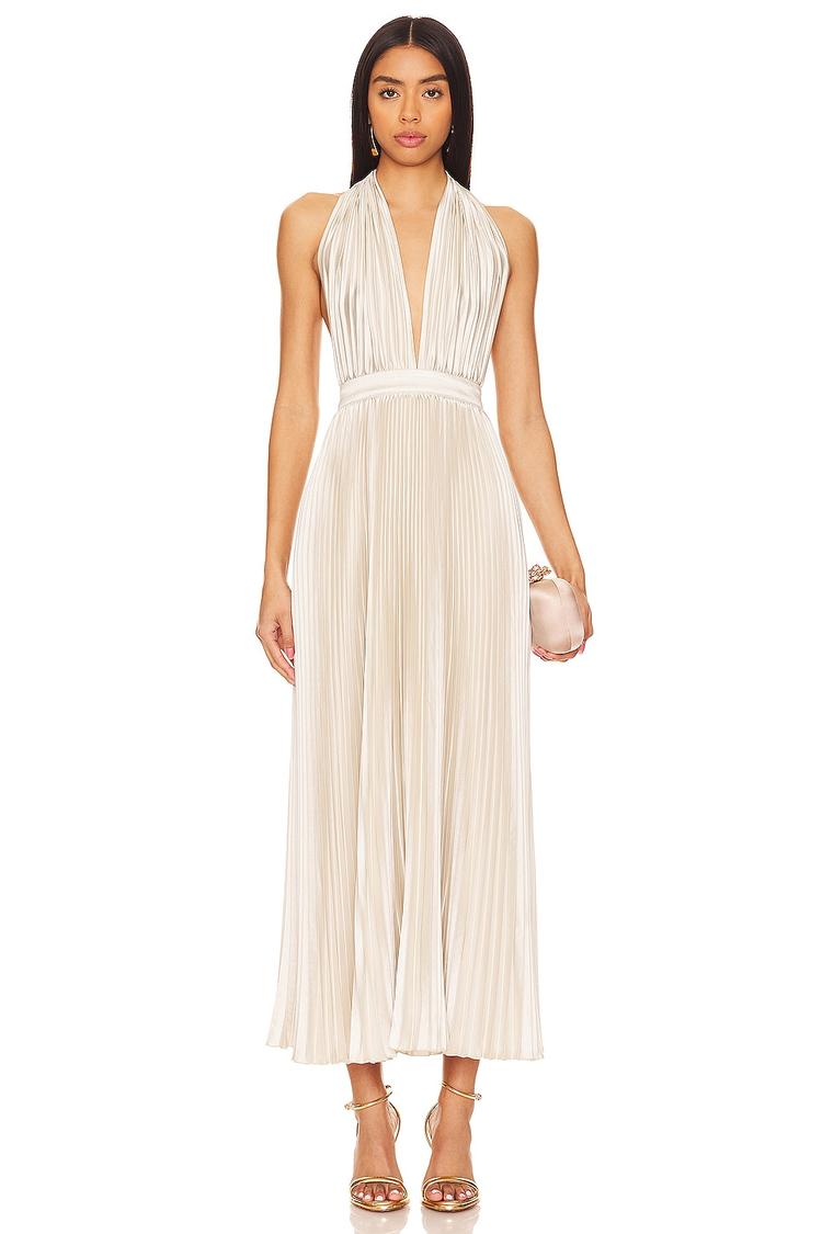 Soft matte ivory satin and delicate pleating define this elegant slip dress, flowing gracefully to a midi length. Featuring a plunging neckline and sleeveless strapless styling, it fastens with a concealed back zipper and a chic halterneck tie closure that accentuates the open back. The flowy fit and clean hemline create a modern silhouette perfect for formal occasions, cocktail parties, and wedding guest attire during spring and summer seasons.