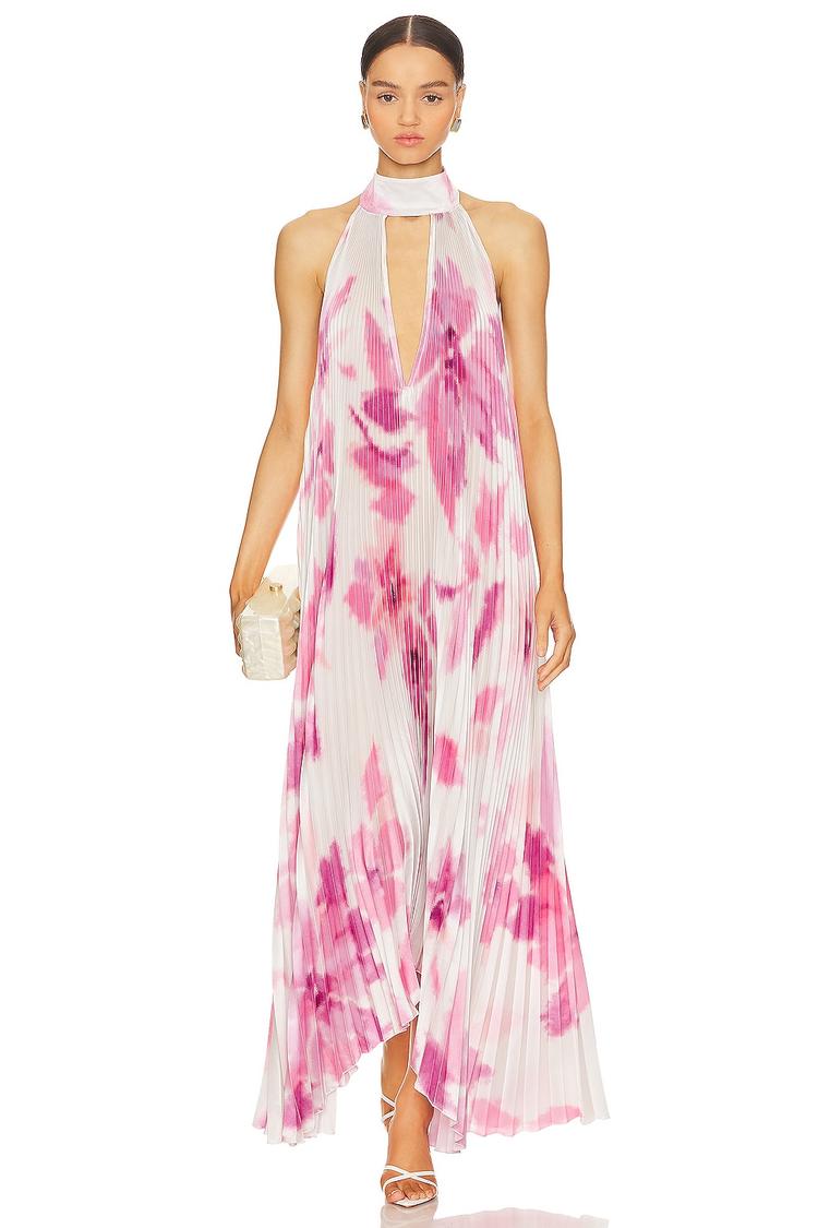 Sunlit occasions call for this elegant column gown featuring a halter neckline and an open back that exudes sophistication. Crafted from ribbed satin polyester, it drapes flowy with delicate pleats and an asymmetric hemline for graceful movement. The pull-on design with an elastic waist ensures comfort and ease, making it ideal for cocktail parties, formal events, and wedding guest attire during spring and summer. The soft white base adorned with shimmering pink floral prints adds a fresh, romantic touch to your special moments.