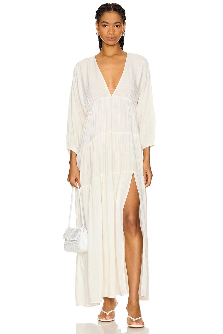 Soft midweight gauze fabric in a flowing maxi silhouette defines this loose fit cover-up dress, perfect for beach days or casual vacation wear. The plunging V-neck front and tie-back closure add breezy elegance, while three-fourth sleeves provide light coverage. Ruffled tiered details enrich the off-white hue with subtle texture, complemented by a side slit that enhances movement. This bohemian-inspired cover-up transitions effortlessly from sunny spring outings to relaxed summer escapes, combining comfort and style in one versatile piece.