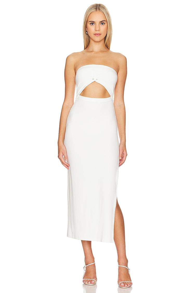 A sleek white midi slip dress crafted from stretch viscose and elastane jersey delivers a body-hugging fit with effortless pull-on styling. The strapless straight neckline features a chic twist and bold front cut-out detail, complemented by a side slit that adds sultry movement. This modern and trendy silhouette is perfect for summer nights, cocktail parties, or date nights where minimalist elegance meets sexy sophistication.