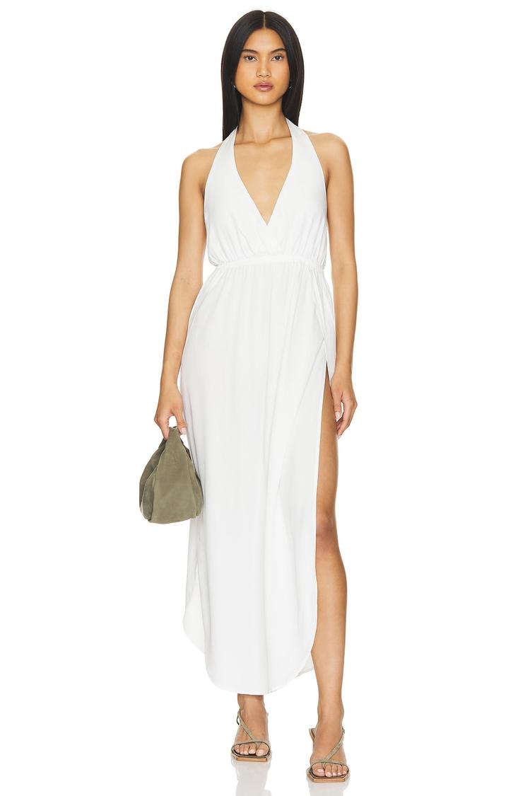 Soft white voile fabric defines this flowing maxi cover-up, perfect for warm weather beach days or casual vacation lounging. The halter neck with a tie-up back adds a flattering neckline and adjustable fit, while the sleeveless, strapless styling enhances its breezy, relaxed silhouette. Side slits provide ease of movement and a subtle hint of allure, making it an ideal choice for spring and summer getaways. Its clean hemline and lightweight design make this cover-up a versatile essential for casual chic beachwear or poolside style.
