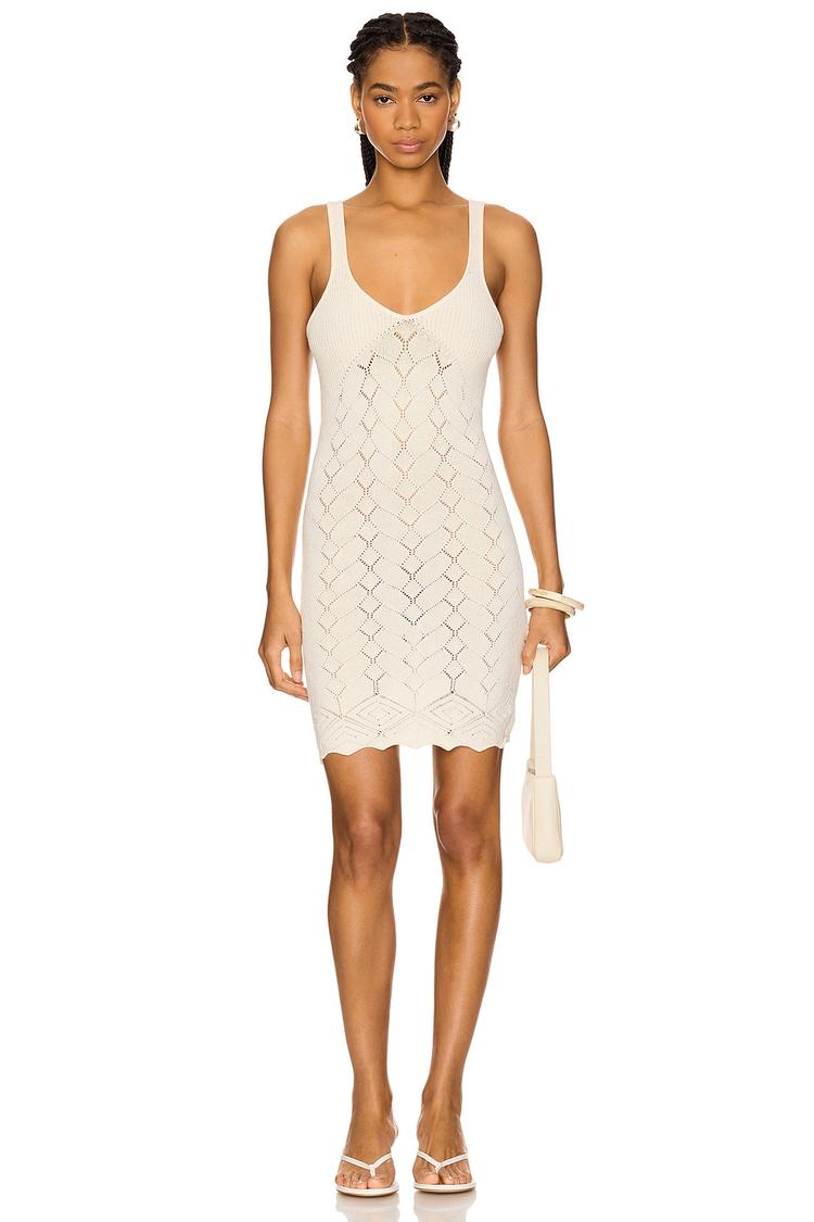 Soft, semi-sheer knit fabric and a slim slip dress silhouette create an effortlessly chic summer look. This mini-length dress features delicate spaghetti straps and a flattering U-neckline, complemented by a striking tie-back closure that adds a playful detail. The matte cream shade enhances its minimalist appeal, perfect for casual beach days, vacation outings, or stylish brunch dates. Its lightweight viscose blend with nylon and elastane ensures comfort with a subtle stretch, making it ideal for warm-weather occasions where effortless style meets breathable fabric.