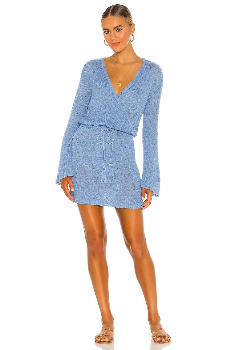 Soft knit fabric and a relaxed silhouette define this light blue mini wrap dress with a flattering surplice neckline and long regular sleeves. The semi-sheer texture adds subtle allure while the drawstring waist enhances the fit, creating a casual chic look perfect for spring and summer brunches, casual dates, or laid-back everyday wear. Its clean hemline and covered back provide a polished finish, making it a versatile piece for effortless style in transitional seasons.