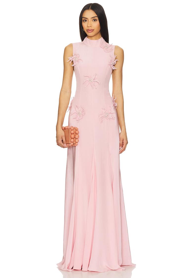 Soft crepe silk in a flowing maxi silhouette creates an effortlessly elegant look with a fitted column cut that flatters the figure. The halter neck and open back with adjustable straps add a sophisticated touch, complemented by delicate 3D floral appliques on the front and back. Perfect for spring and summer formal occasions, cocktail parties, or wedding guest attire, this dress combines luxurious fabric with refined design details for timeless appeal.