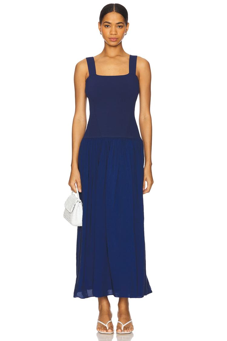 Clean lines and a rich navy hue define this midi-length A-Line dress with a ribbed bodice and ruffled skirt that flows gracefully with each step. The square neckline and wide straps enhance its timeless appeal, while a side slit adds subtle movement and ease. Crafted from a breathable linen-viscose blend with a touch of polyester, it offers comfort and style for spring through autumn. Ideal for casual days, brunch outings, or date nights, this classic yet minimalist dress embodies effortless sophistication.