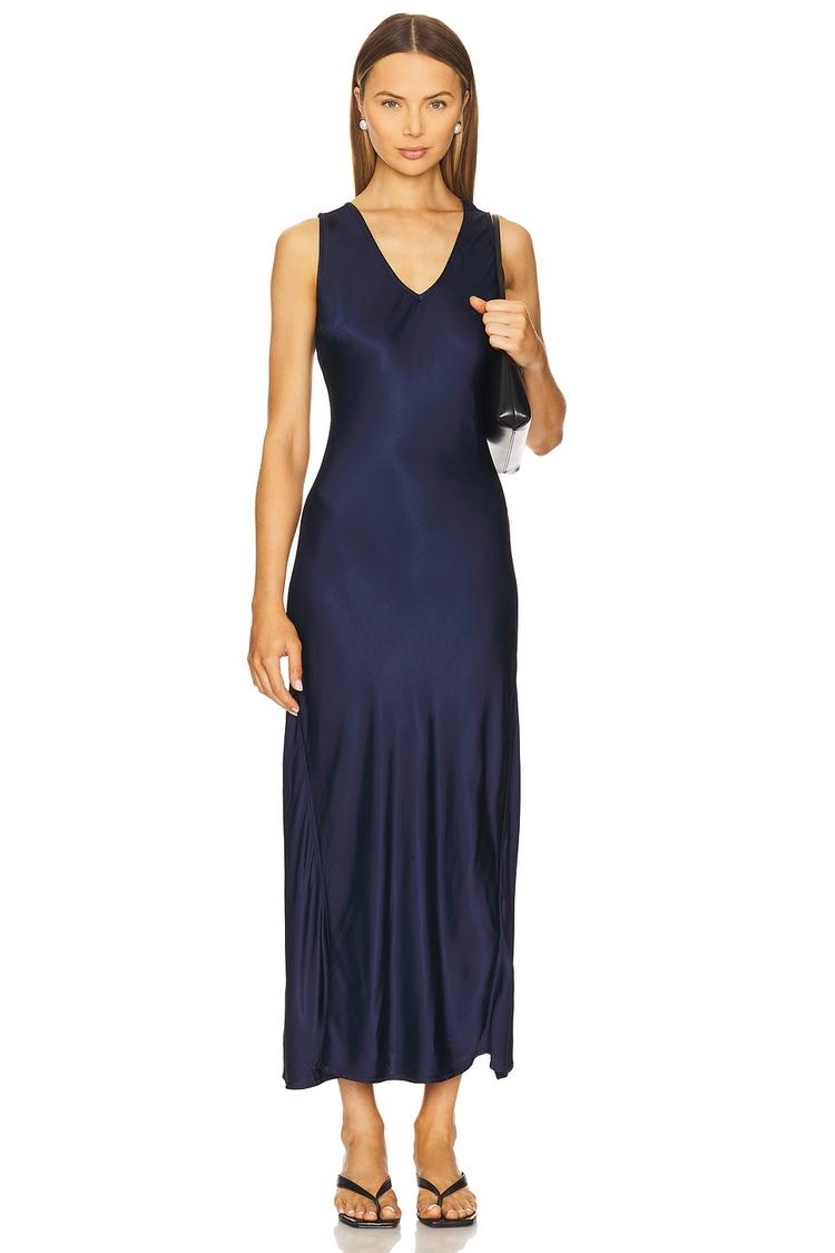 Soft, midweight satin fabric in a deep matte navy hue shapes this elegant slip dress with a maxi length and flowy fit. The V-neckline and sleeveless silhouette enhance its minimalist sophistication, while the covered back offers a sleek finish. Designed for versatility, this dress is perfect for date nights, cocktail parties, or a night out on the town. Its pull-on styling ensures effortless wear, making it a chic staple for all-weather occasions.