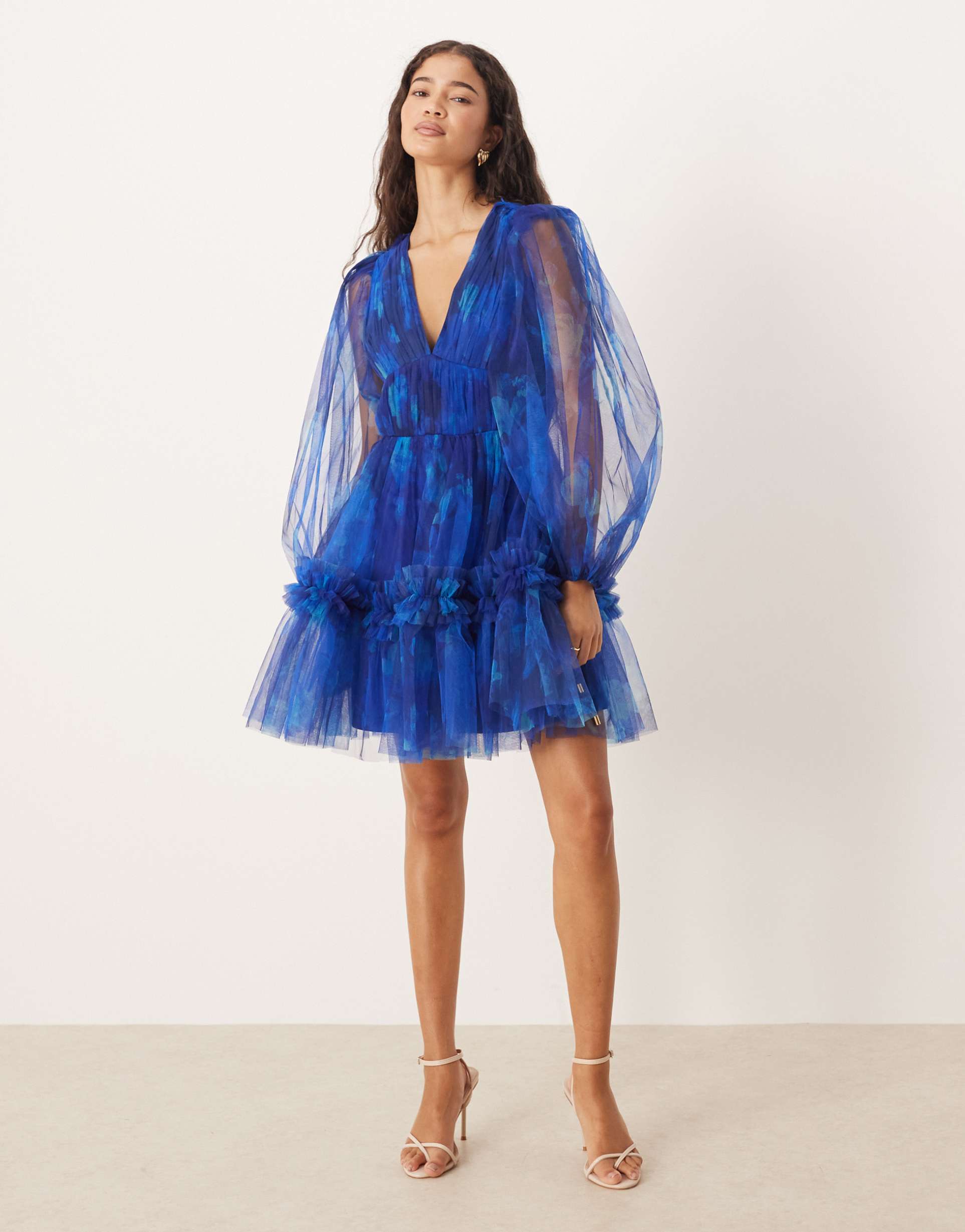 A vibrant matte blue babydoll silhouette with a playful ruffled hem and long blouson sleeves crafted from lightweight sheer organza defines this mini dress. The romantic floral pattern runs all over the dress, perfectly complementing the elegant V-neckline and regular fit. Ideal for spring and summer occasions, this dress suits cocktail parties, date nights, and stylish evenings out. The back zipper closure offers ease of wear, while the airy fabric and ruffled details add a touch of trendy sophistication to your wardrobe.
