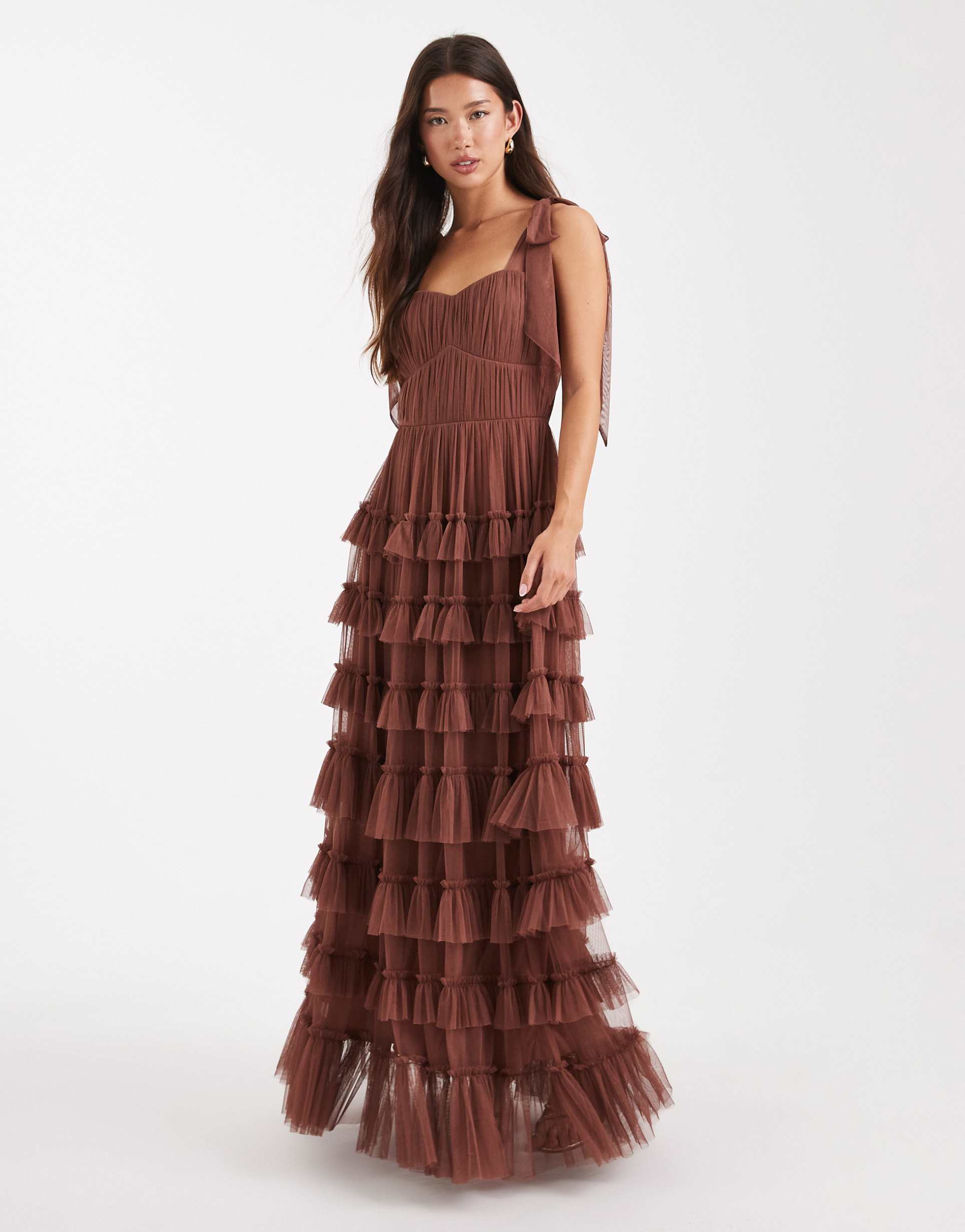 Layered ruffles cascade elegantly on this matte brown tulle maxi dress, featuring a romantic sweetheart neckline and wide tie straps that enhance its regular fit silhouette. The sheer, tiered tulle fabric adds delicate texture and movement, perfect for spring, summer, or autumn weddings and formal occasions. Its covered back with a shirred stretch panel ensures comfortable wear, making it an ideal choice for bridesmaids or cocktail events seeking timeless sophistication and graceful style.