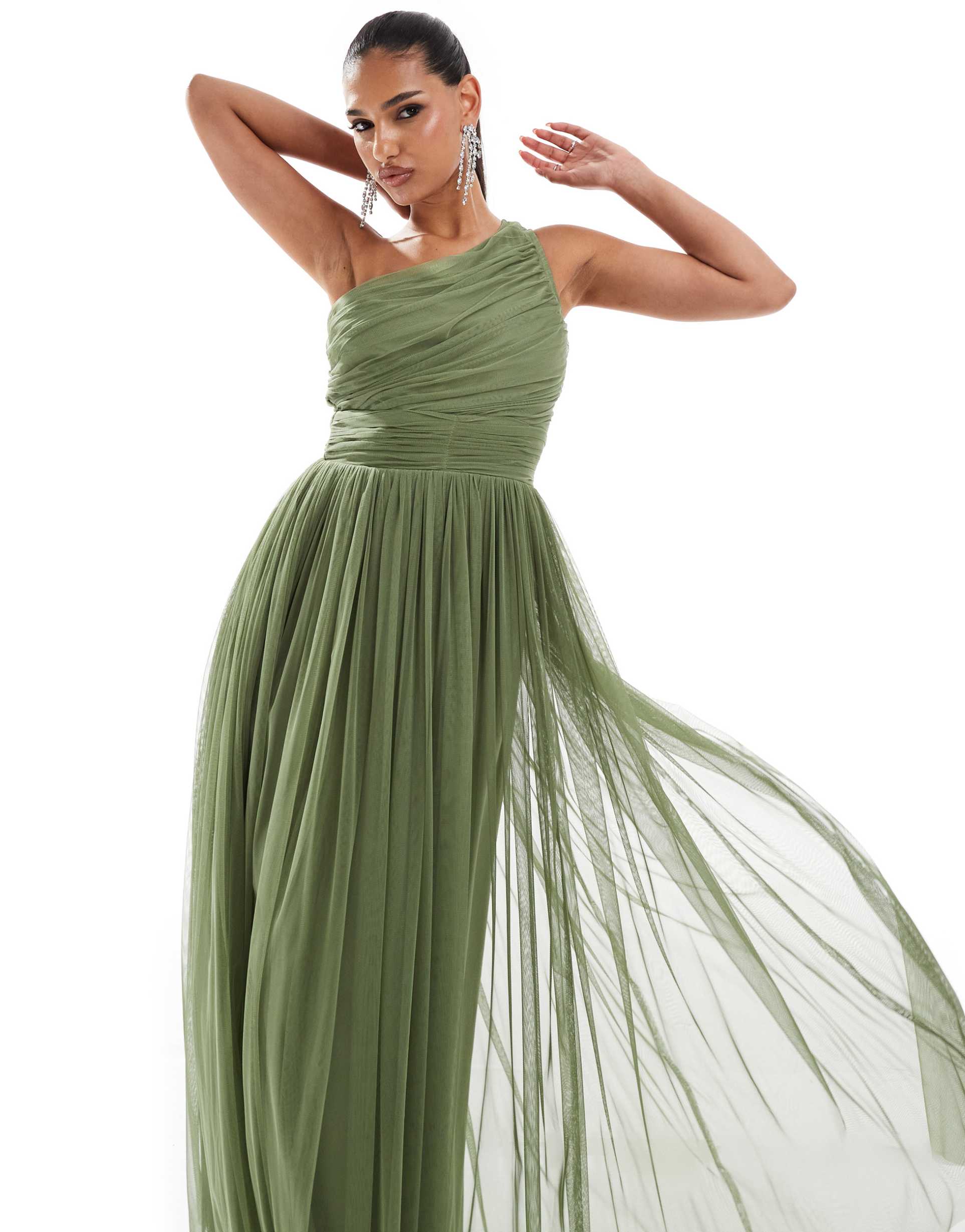 LACE & BEADS BRIDESMAID ONE SHOULDER TULLE MAXI DRESS IN SOFT OLIVE