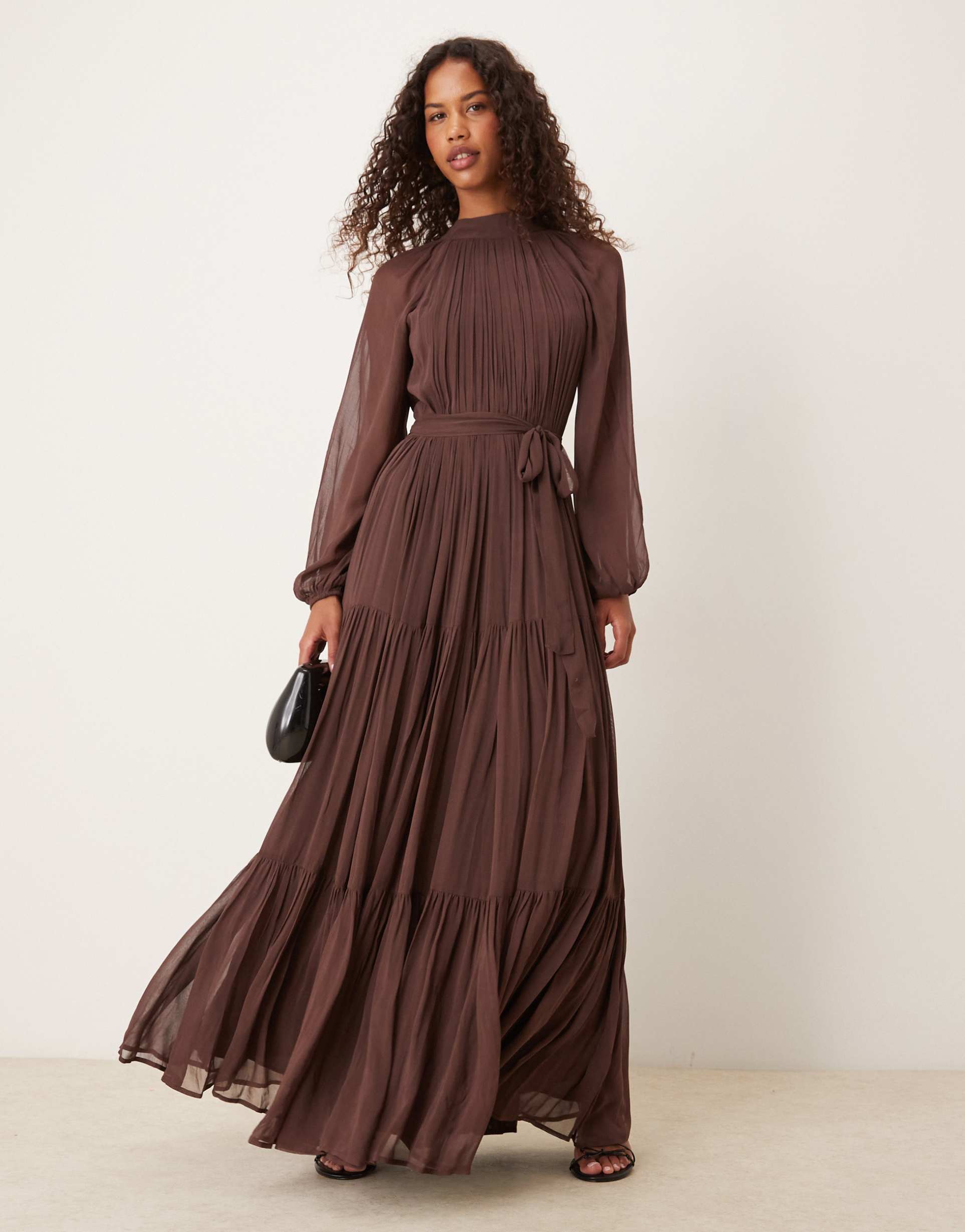 Soft chiffon fabric and a flowing maxi hem with ruffled detailing create an elegant silhouette in this matte brown dress. The regular fit and high neckline complement blouson long sleeves and an open back with a tied halter neck for a sophisticated touch. Ideal for autumn and winter evenings, this dress works beautifully for date nights, cocktail parties, and formal occasions. Its sheer texture and ruffled hem add delicate movement, offering a graceful and refined look for special events.