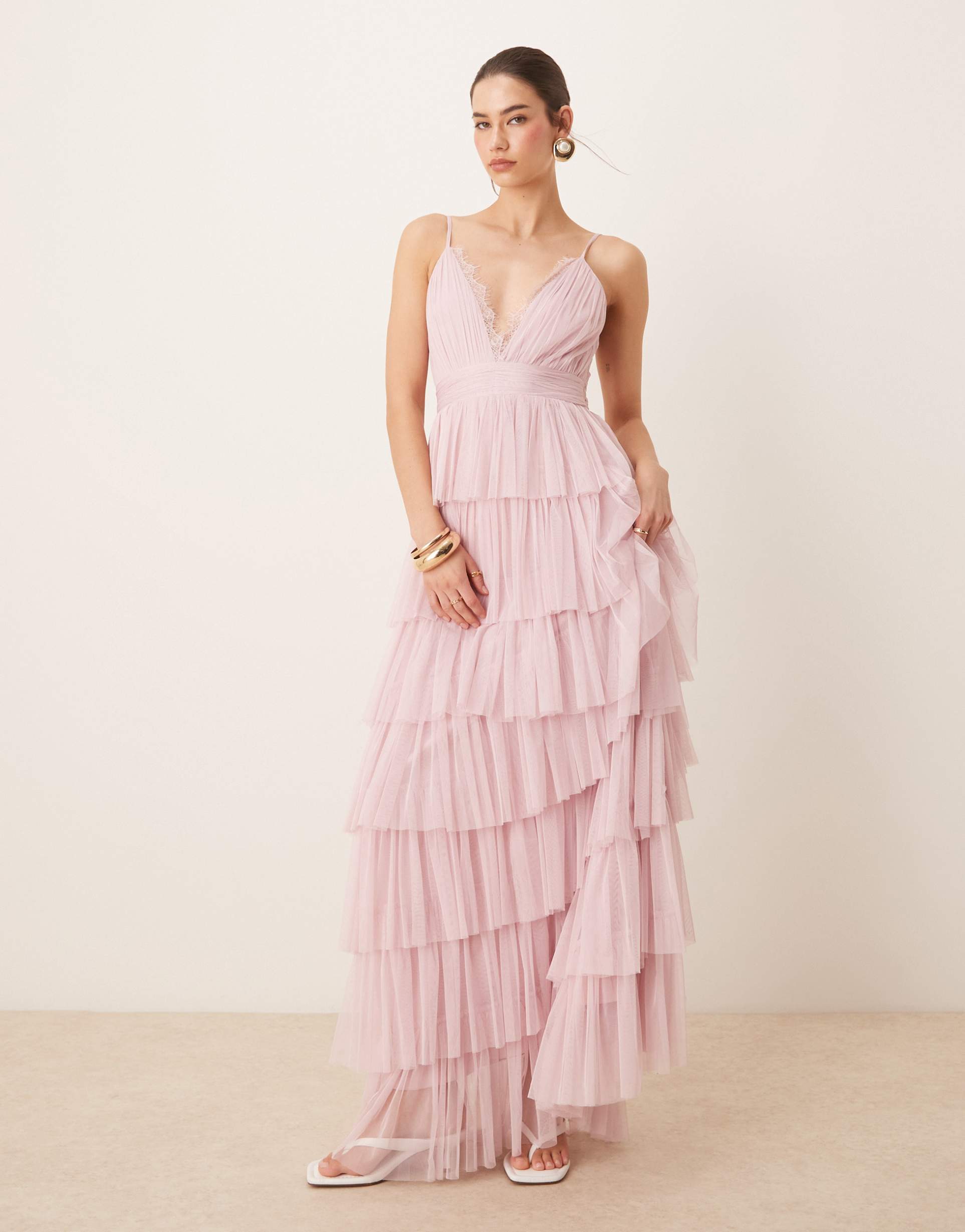 LACE & BEADS LACE TRIM CAMI TULLE TIERED MAXI DRESS IN POWDER PINK