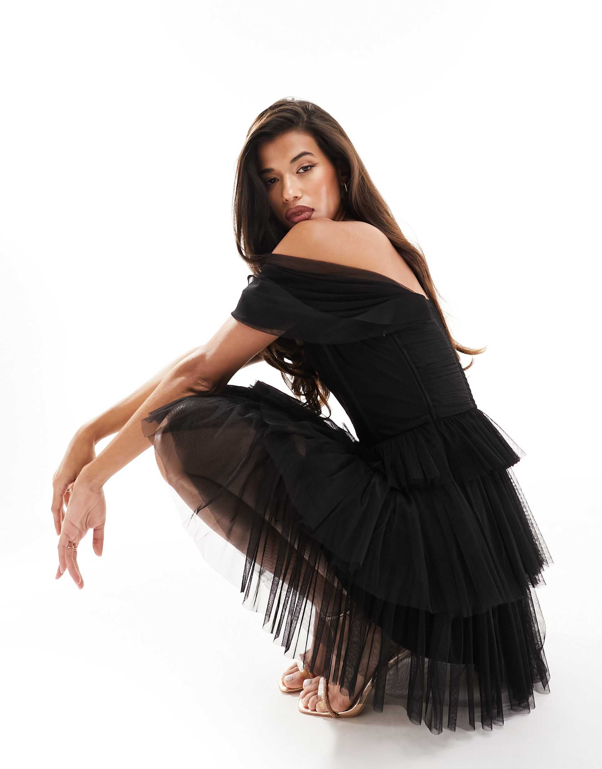 LACE & BEADS OFF-SHOULDER CORSET TULLE MINI DRESS IN BLACK