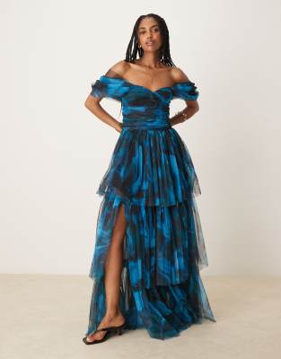 Step into a fairytale moment with this Lace & Beads off-the-shoulder tulle maxi dress in watercolor blue. The lightweight tulle layers create a romantically tiered silhouette with a graceful high-low hem, while an off-shoulder neckline and fitted bodice define a flattering, feminine line. Made from polyester with a delicate sheer overlay, it offers a structured yet ethereal look—perfect for formal events, garden weddings, or a chic evening soiree. Pair with strappy heels and subtle jewelry to let the watercolor print and sculpted silhouette shine. An elegant, head-turning statement for special occasions.