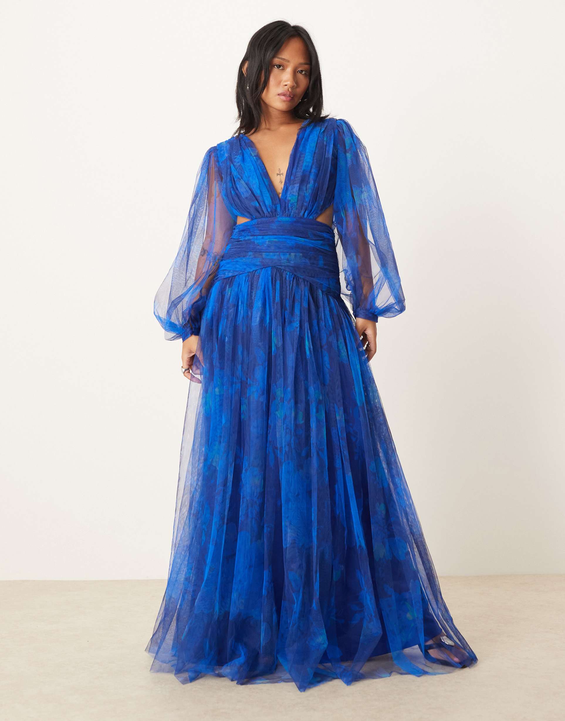 A dramatic cobalt tulle maxi features a plunging neckline and balloon long sleeves, creating an elegant and romantic silhouette. The floral pattern flows all over the sheer layers, complemented by a delicate bow detail at the open back with a back zipper closure. Designed for petite frames with a regular fit, this dress offers a dropped hemline that adds graceful movement. Perfect for formal events, cocktail parties, and wedding guest occasions in spring and summer, its fine polyester tulle fabric adds a sophisticated sheer texture to your evening wardrobe.