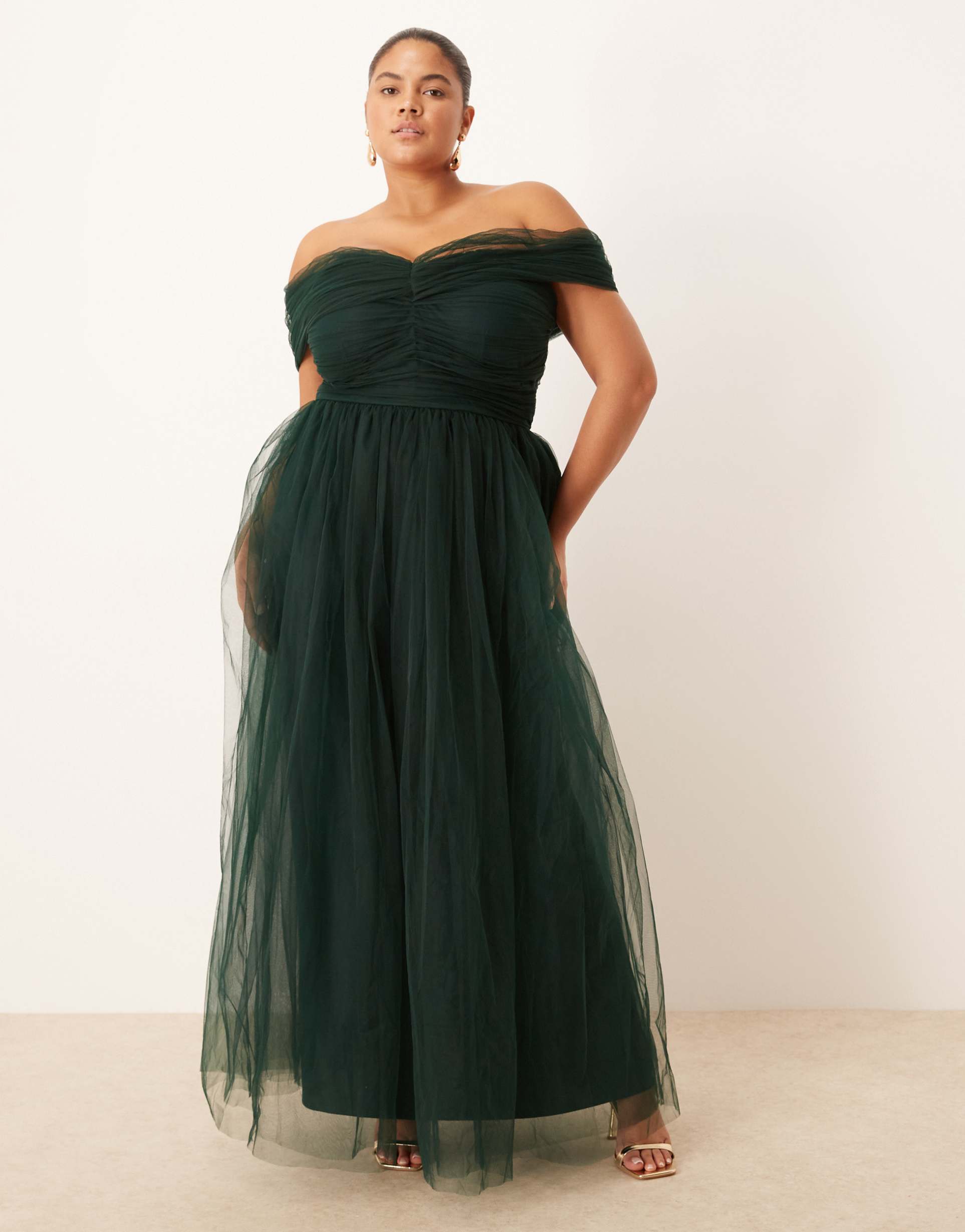 LACE & BEADS PLUS BOW FALLEN SHOULDER MAXI TULLE DRESS IN FOREST GREEN