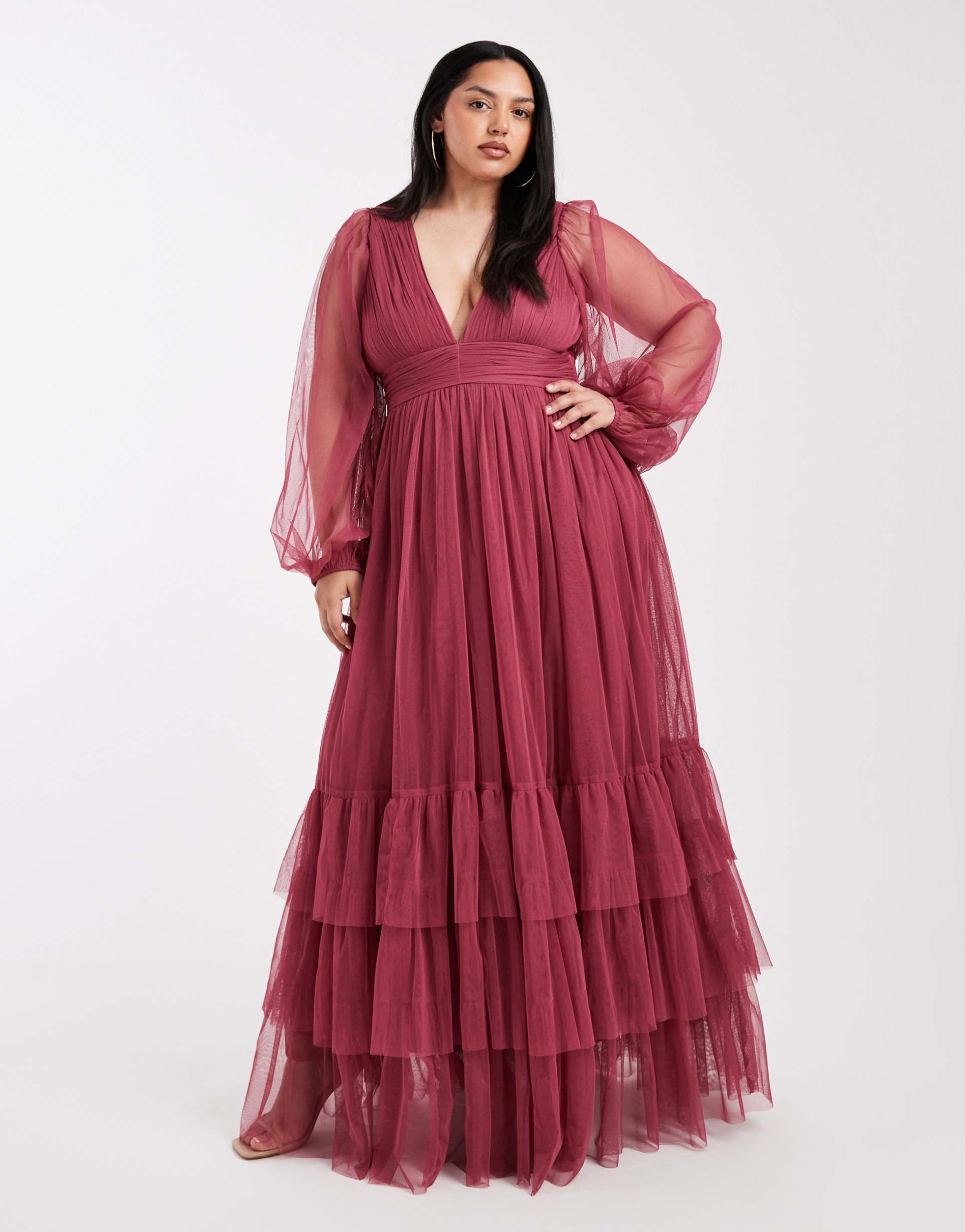 Soft tulle layers and a flowing maxi hem create a romantic silhouette in this dusty rose plus-size gown. The plunge neckline and balloon long sleeves add elegant volume, while ruffle details cascade beautifully across the skirt. Crafted from sheer polyester tulle with a fitted waist, this regular fit dress offers graceful movement for weddings, formal occasions, or cocktail events. Its classic style and timeless charm make it a versatile choice for special celebrations in any season.