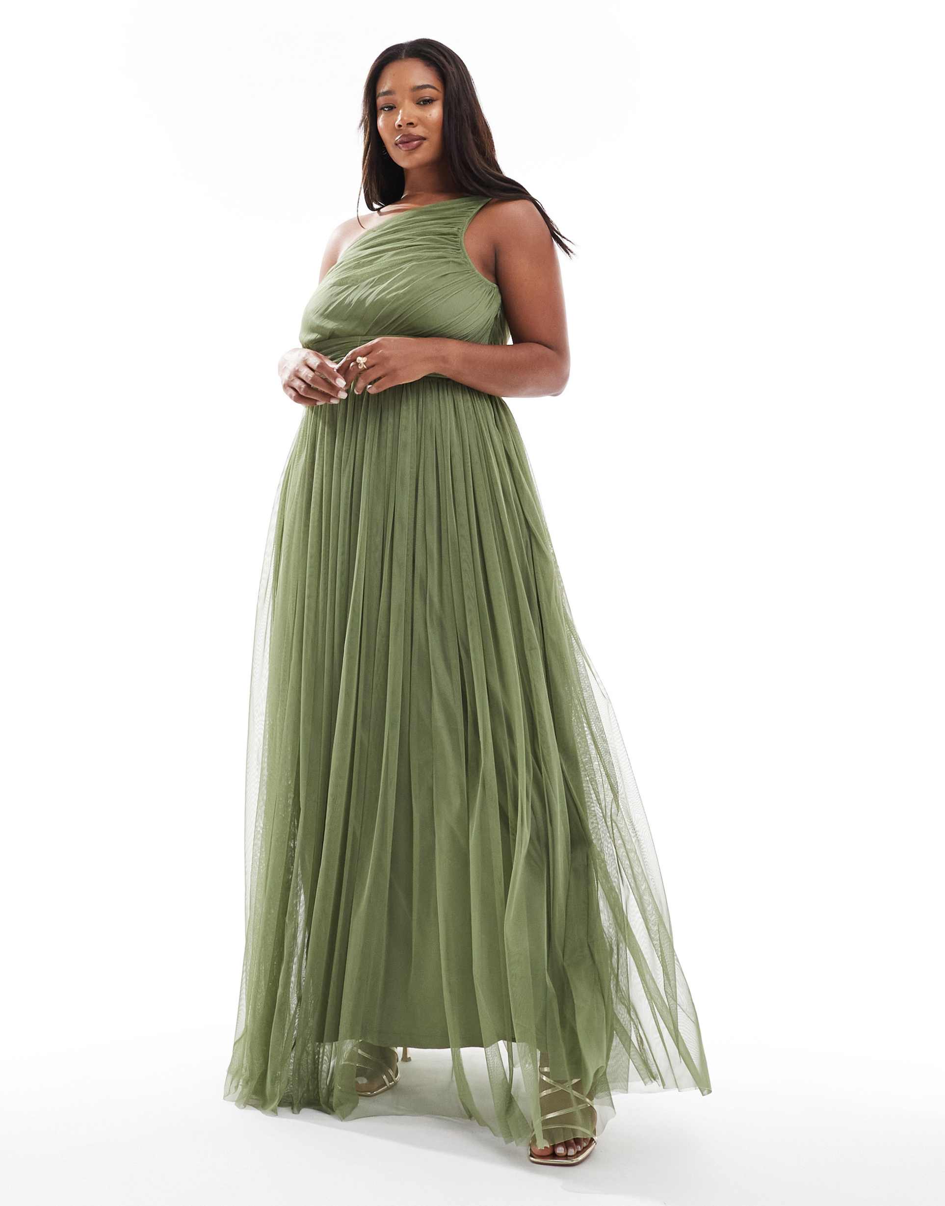 LACE & BEADS PLUS BRIDESMAID ONE SHOULDER MAXI DRESS IN SOFT OLIVE GREEN