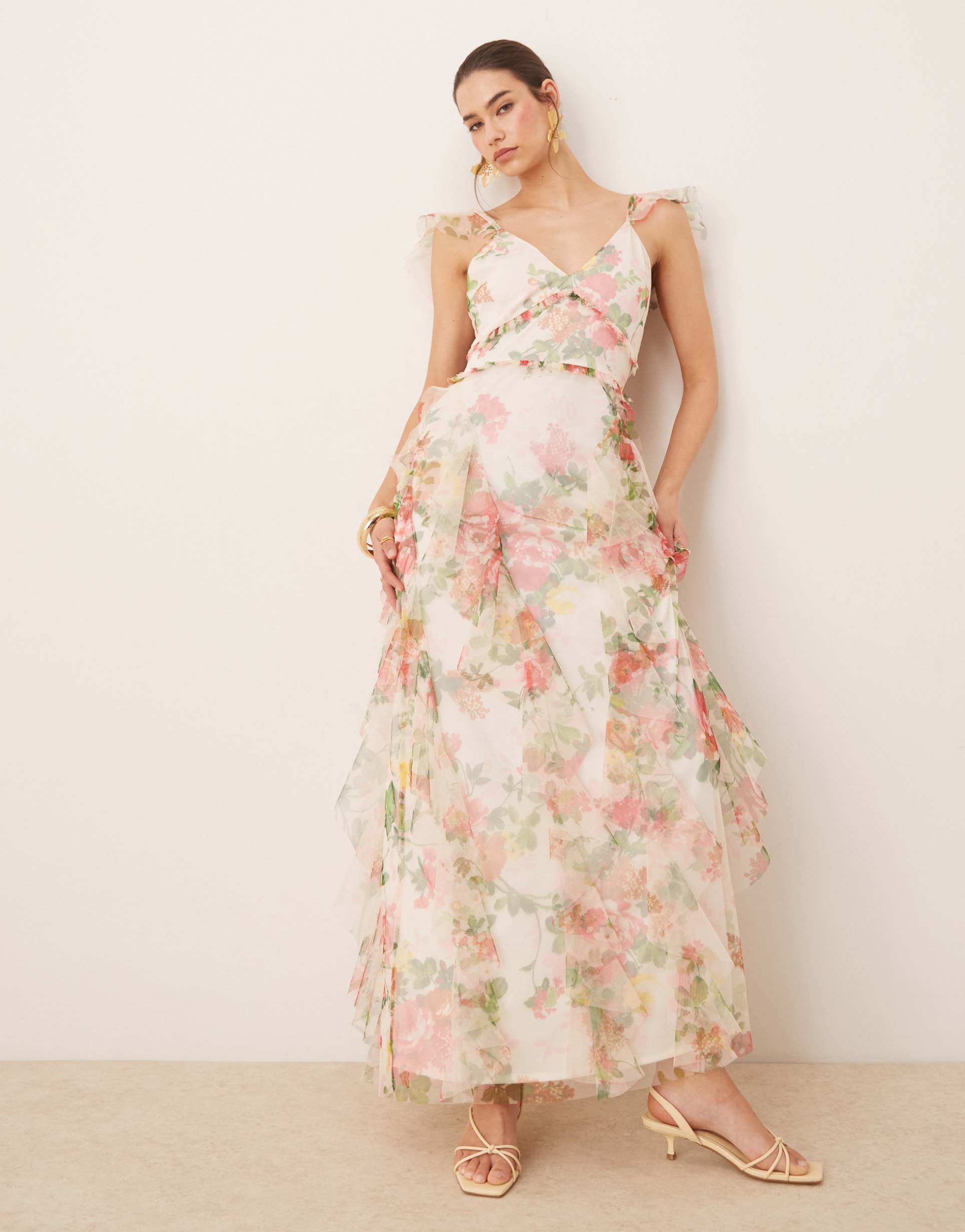 LACE & BEADS RUFFLE MIDAXI TULLE DRESS IN BRIGHT FLORAL