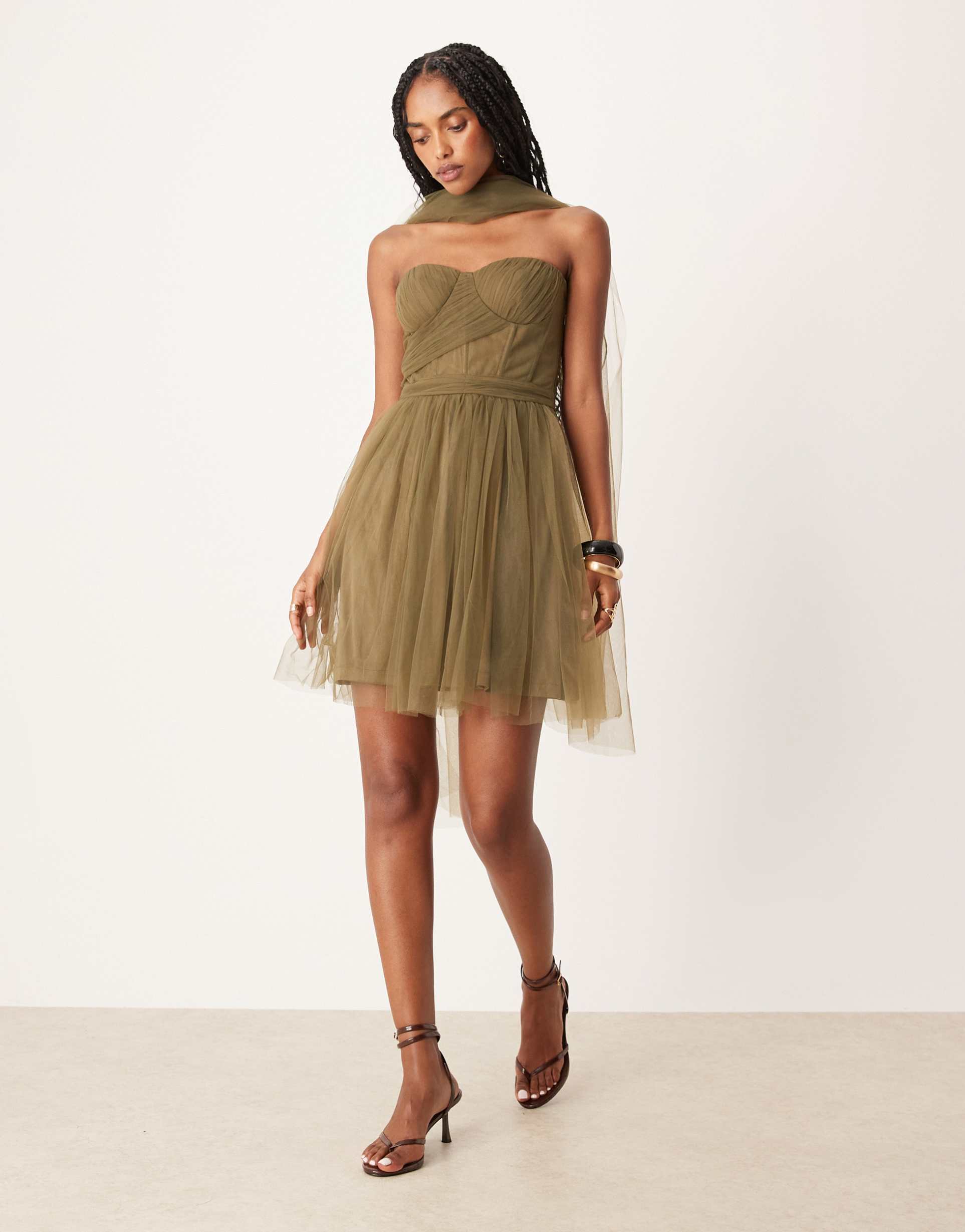 Soft tulle overlays a structured corset bodice in a deep olive hue, creating a chic and modern mini dress perfect for warm weather evenings. The scarf neck detail adds an elegant touch to the strapless silhouette, while the regular fit ensures comfortable wear. Ideal for cocktail parties, date nights, or nights out, this dress combines sheer texture with a clean hemline to deliver a sophisticated yet flirty look.