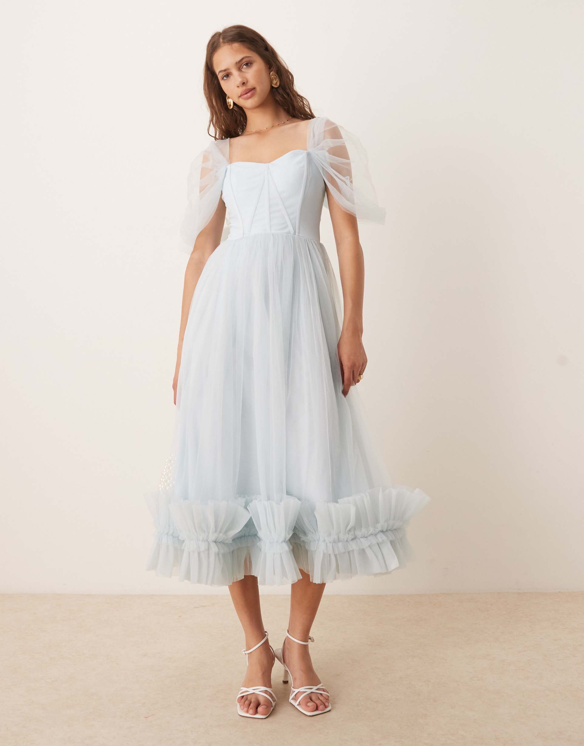 Soft tulle layers and sheer puff sleeves define this sky blue fit and flare midaxi dress, featuring a romantic sweetheart neckline and delicate ruffled hem. The regular fit silhouette with boning detail enhances the shape while a back zipper ensures a smooth closure. Crafted from lightweight polyester mesh and tulle, this dress is perfect for spring and summer occasions such as brunch, date nights, and cocktail parties. Its elegant design and airy fabric create a dreamy, feminine vibe that effortlessly blends classic charm with modern style.