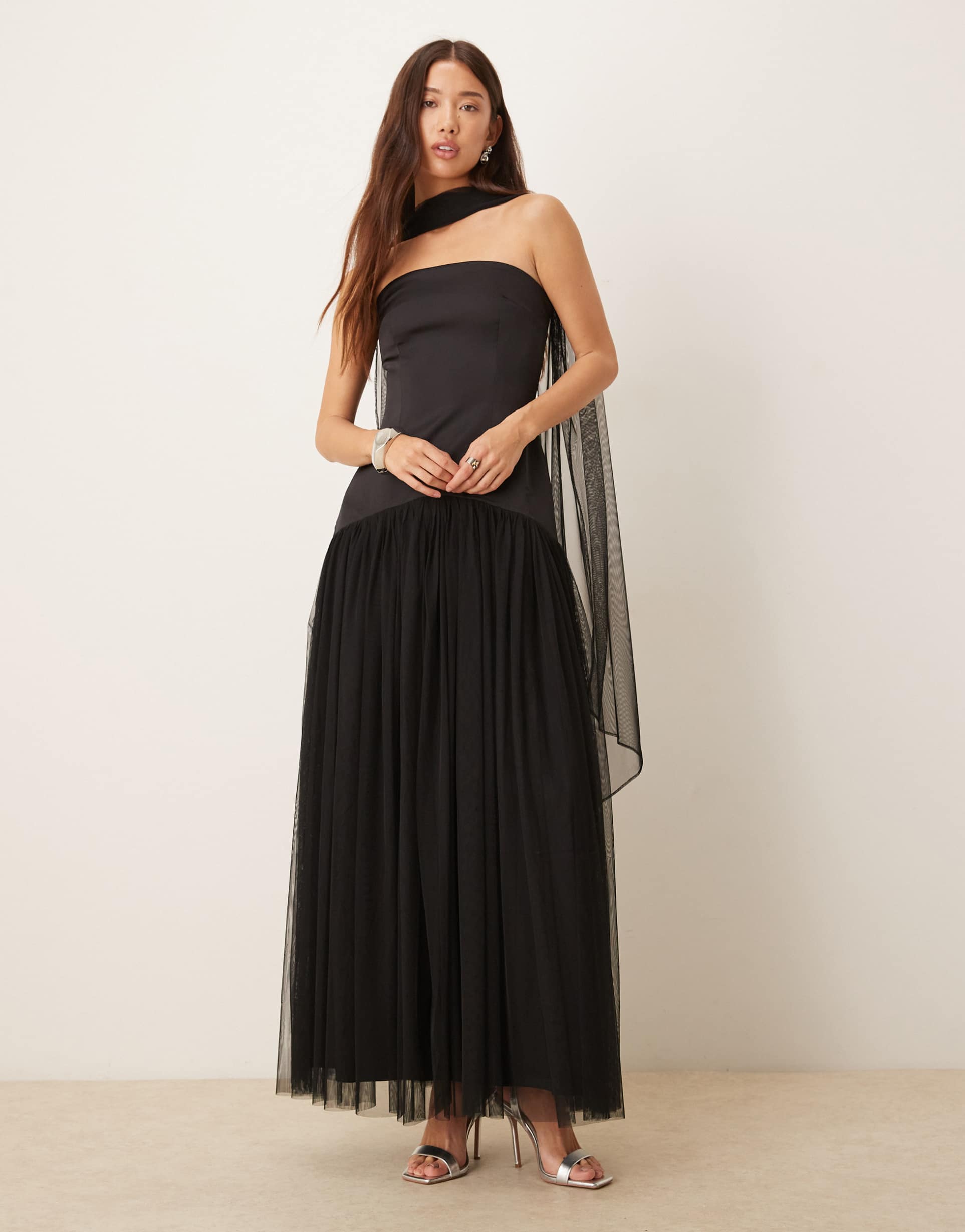 Soft mesh fabric and a strapless bandeau neckline create an elegant silhouette in this regular fit maxi dress. The dropped waist and flowing skirt drape beautifully, while the included scarf adds a sophisticated touch. With a back zipper closure and a clean hemline, this versatile black dress suits formal events, cocktail parties, and evening occasions with ease.