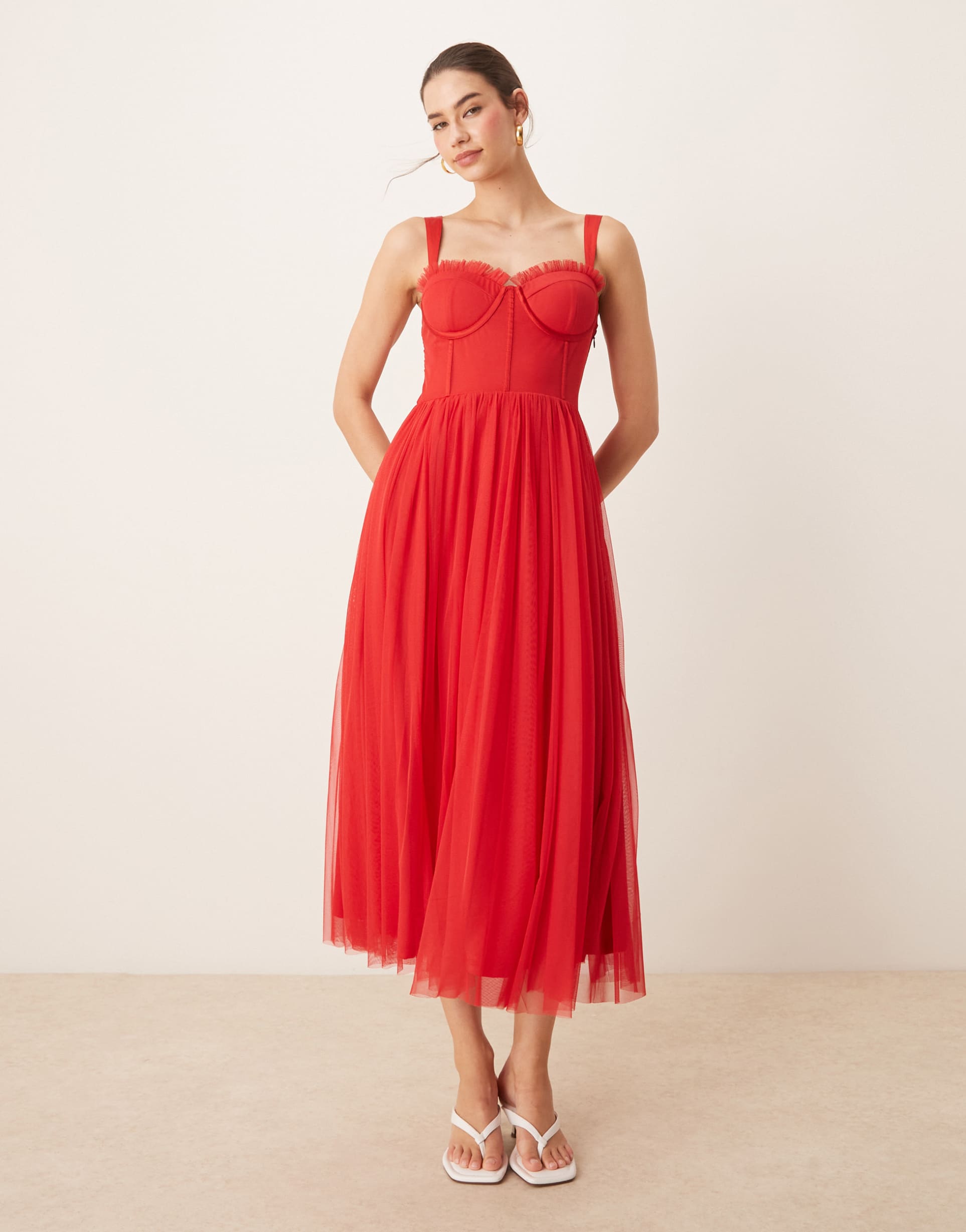 LACE & BEADS TULLE CORSET MIDI DRESS IN RED
