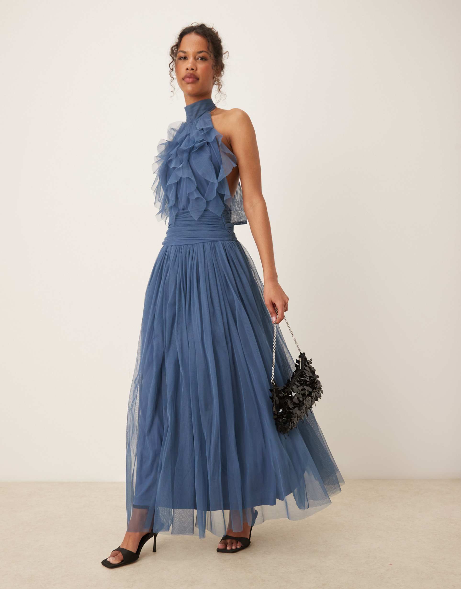 Ethereal blue tulle layers cascade in ruffles across a sleeveless, high-neck maxi dress that embodies romantic elegance. The regular fit skims the silhouette effortlessly, while the tie and zip-back closure ensure a secure fit. Crafted from sheer, stiff polyester tulle, this A-line dress features clean hemlines and delicate ruffle detailing on the bodice and front. Ideal for spring and summer occasions, it suits cocktail parties, formal events, and wedding guest attire with its graceful, flowing design and sophisticated style.