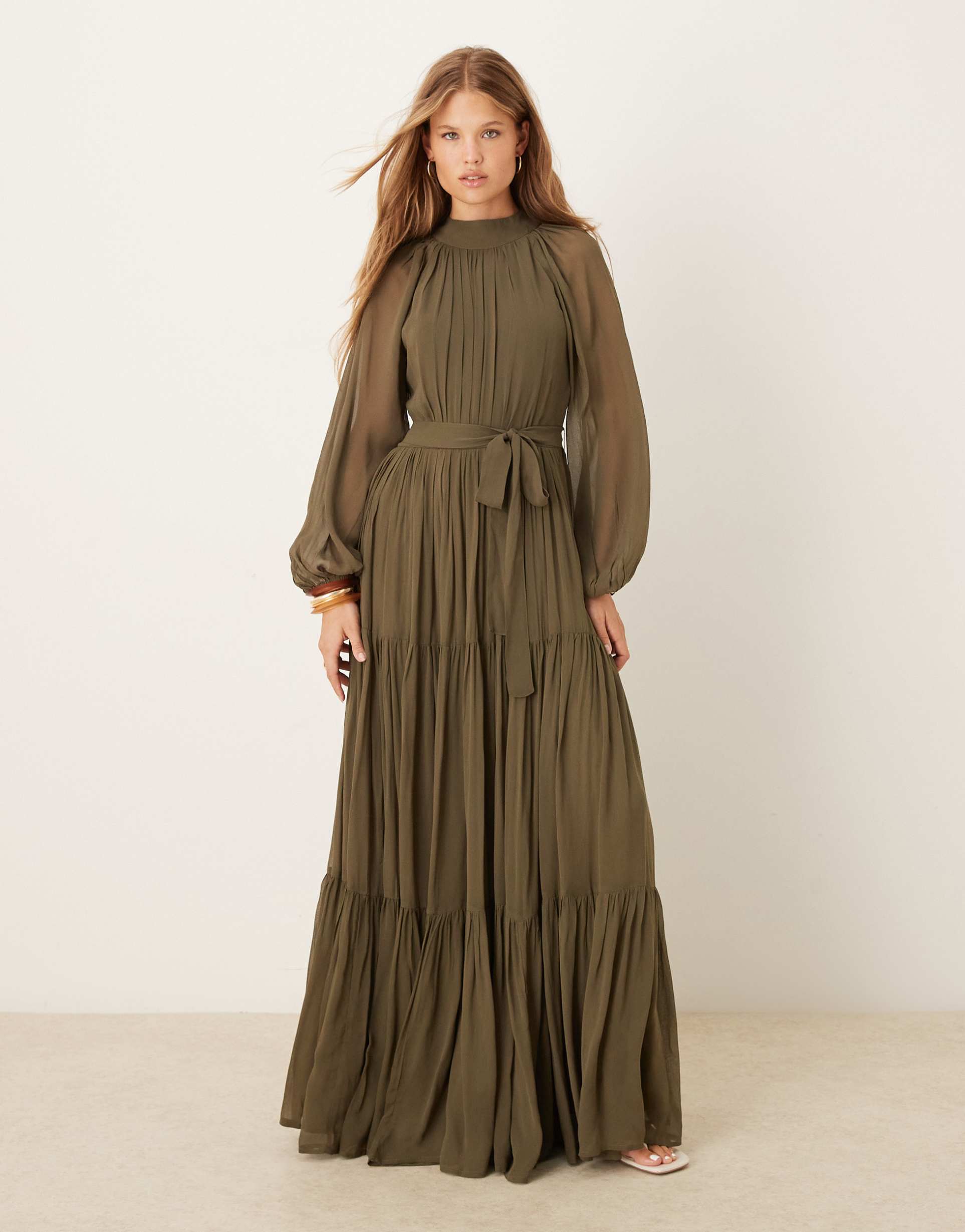 Soft matte olive fabric drapes elegantly in this maxi dress featuring a high neckline and romantic balloon sleeves. The tiered hem creates gentle ruffles that enhance the regular fit silhouette, while the open back with a tie-up closure adds an alluring detail. Crafted from lightweight polyester, this dress is perfect for autumn and spring occasions like brunch, outdoor events, or date nights. Its refined design balances comfort with a sophisticated, timeless style ideal for versatile wear.