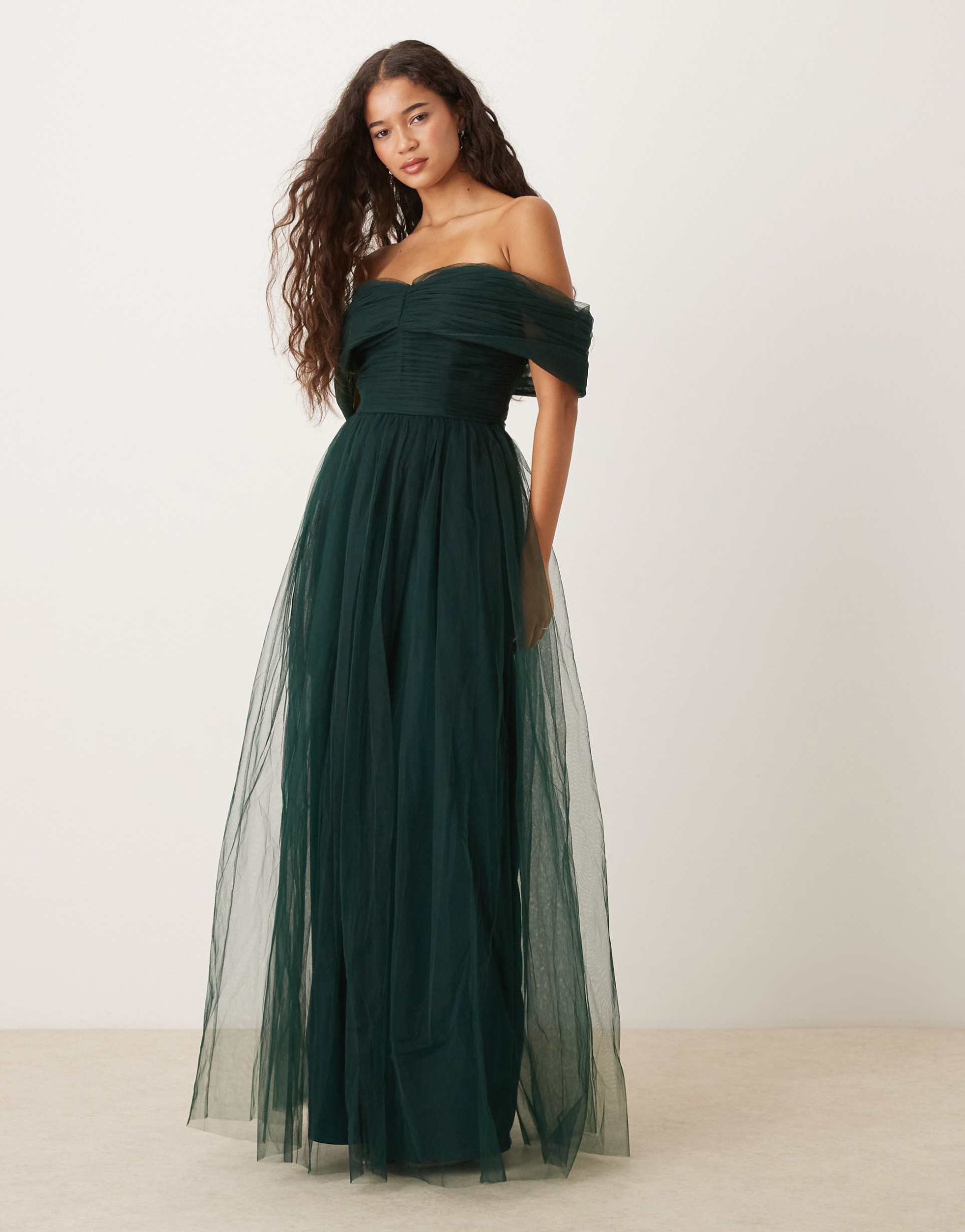 LACE & BEADS BOW FALLEN SHOULDER MAXI TULLE DRESS IN DARK GREEN