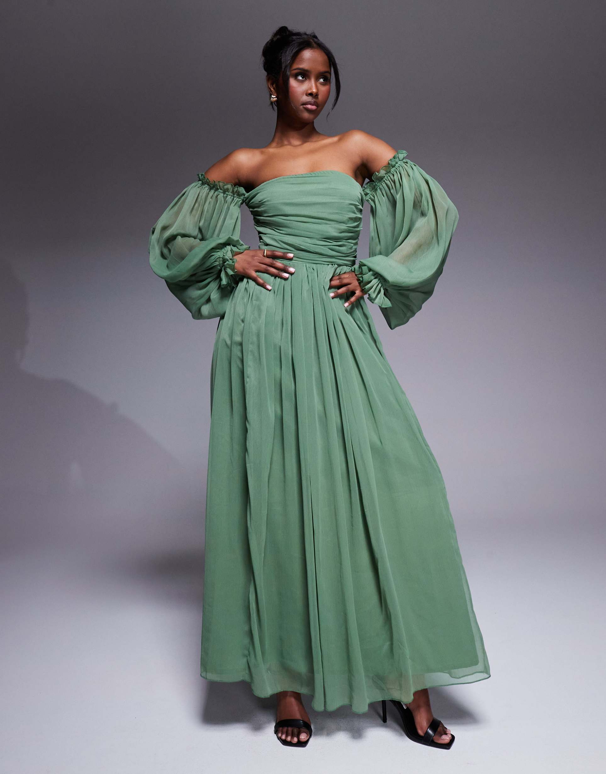 LACE & BEADS OFF SHOULDER BALLOON SLEEVE MAXI DRESS IN OLIVE