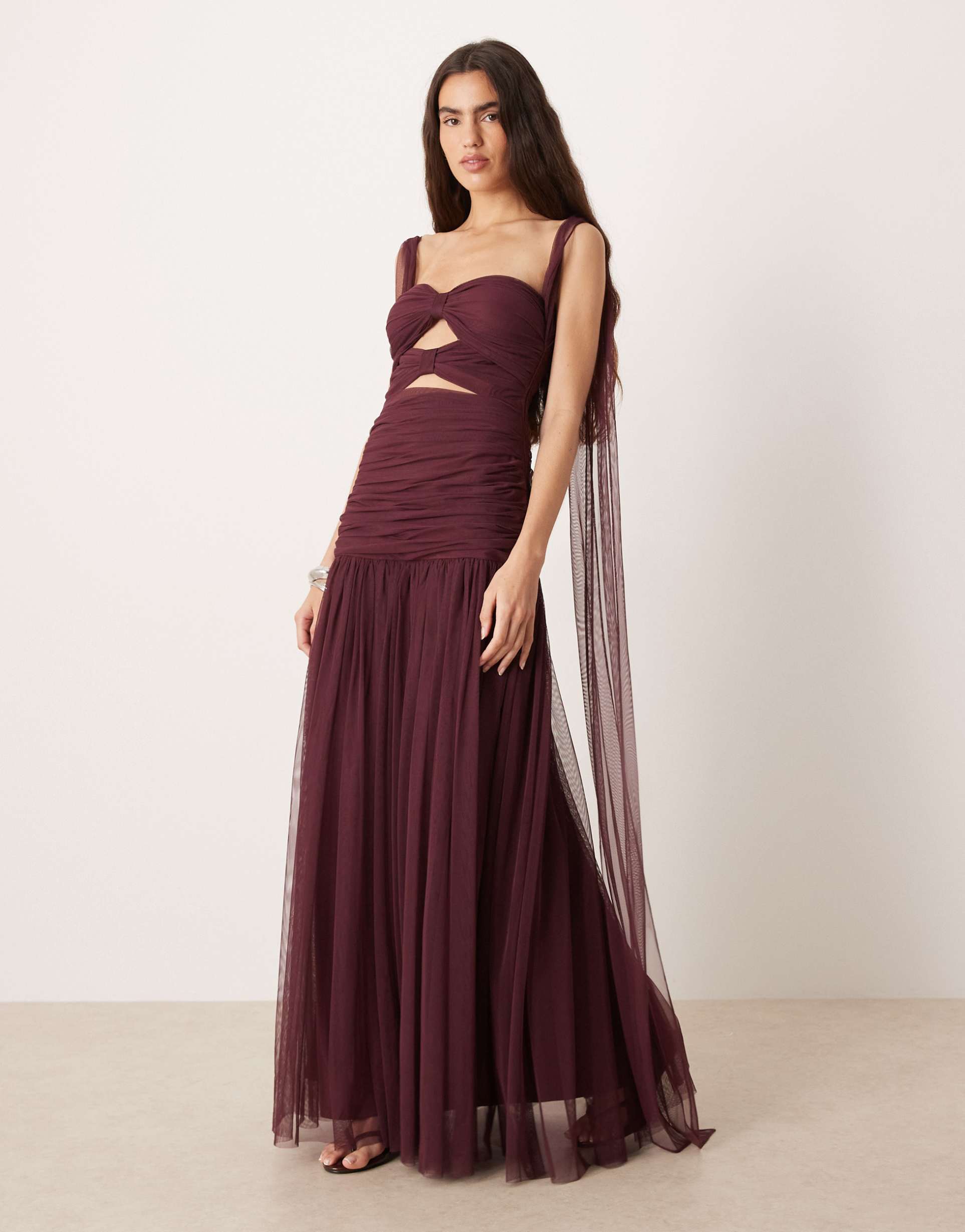 LACE & BEADS TULLE DOUBLE BOW DETAILING CUT OUT MAXI DRESS IN PLUM