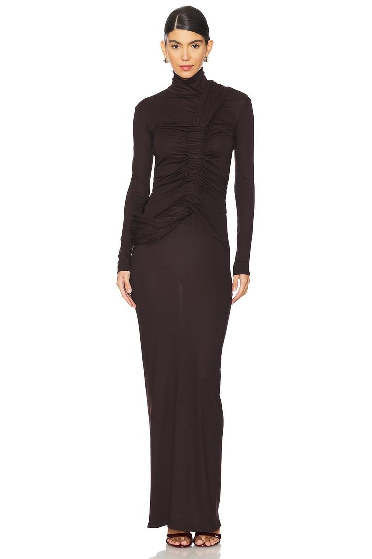 Sleek and refined, this matte black column dress features a turtleneck and long sleeves that offer a modest yet stylish silhouette. Crafted from soft viscose jersey, its draped overlay enhances the bodice and shoulder, creating elegant texture and movement. The slim fit and maxi length elongate the figure, making it a sophisticated choice for cocktail parties, date nights, or evening events in autumn and winter. Designed for ease with pull-on styling and a clean hemline, it combines comfort with understated glamour for versatile, timeless appeal.