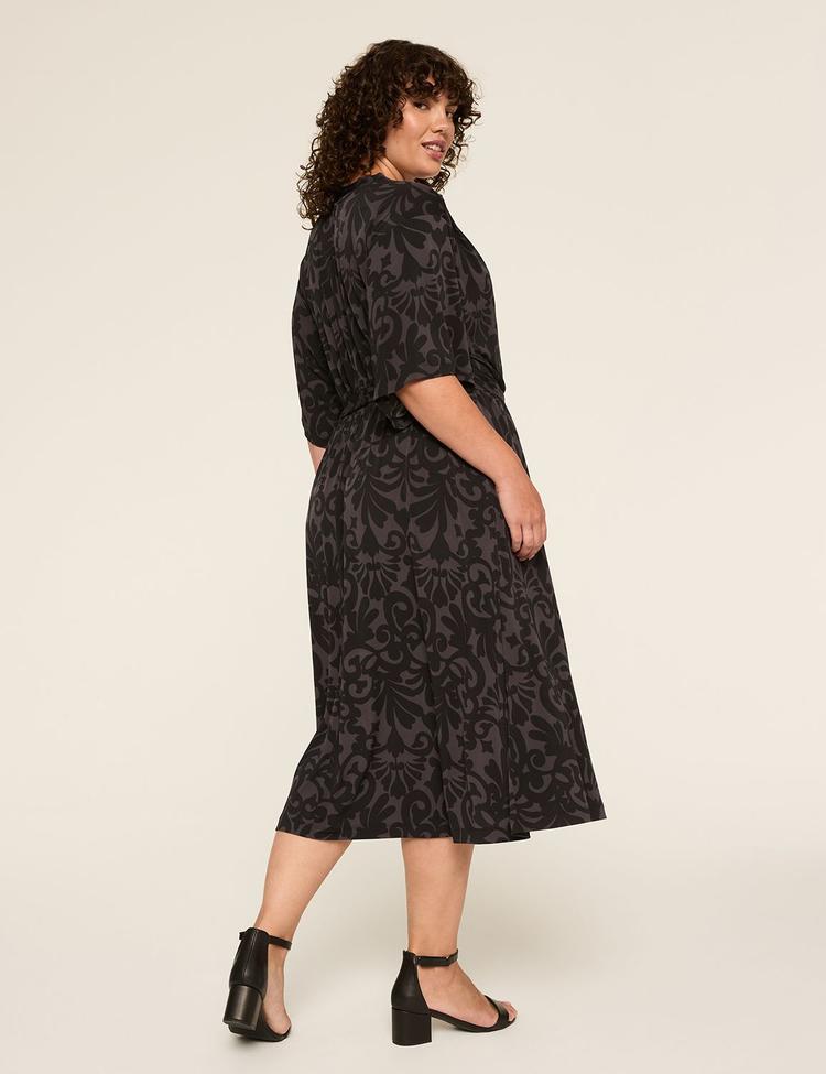 Matte jersey fabric and an adjustable faux-wrap silhouette define this plus size midi dress, delivering both comfort and chic style. The surplice neckline and kimono three-quarter sleeves add effortless elegance, while the self-tie belt and covered elastic waistband ensure a customizable fit. Featuring a subtle abstract all-over print in classic matte black, this dress is finished with practical pockets and a clean hemline for daily wearability. Ideal for casual outings, workwear, or business casual occasions, it transitions seamlessly from brunch to date night with timeless appeal.