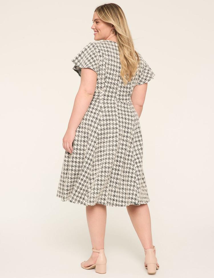 Available in Plus Size Named for our founder, the Lena is the curve-loving dress that launched a million compliments with its iconic tailored bodice, comfy fabric and flattering flare. This dress features a level hem, oh-so-convenient pockets and season-perfect jacquard print. FIT: Lena. Flattering flare silhouette with our iconic tailored bodice. Front Length (On Body): 45" Short length FEATURES: V-neck Short sleeves Pockets Attached self-tie belt Level hem Princess seams Hidden back zipper FABRIC: Soft-textured jacquard fabric with the perfect amount of stretch. Machine Wash 51% Cotton/48% Polyester/1% Spandex Item Number #412708 Imported Plus Size Dress ". Plus Size Lena V-Neck Level-Hem Jacquard Dress, in Black/White Houndstooth, 18/20, Women's, Lane Bryant