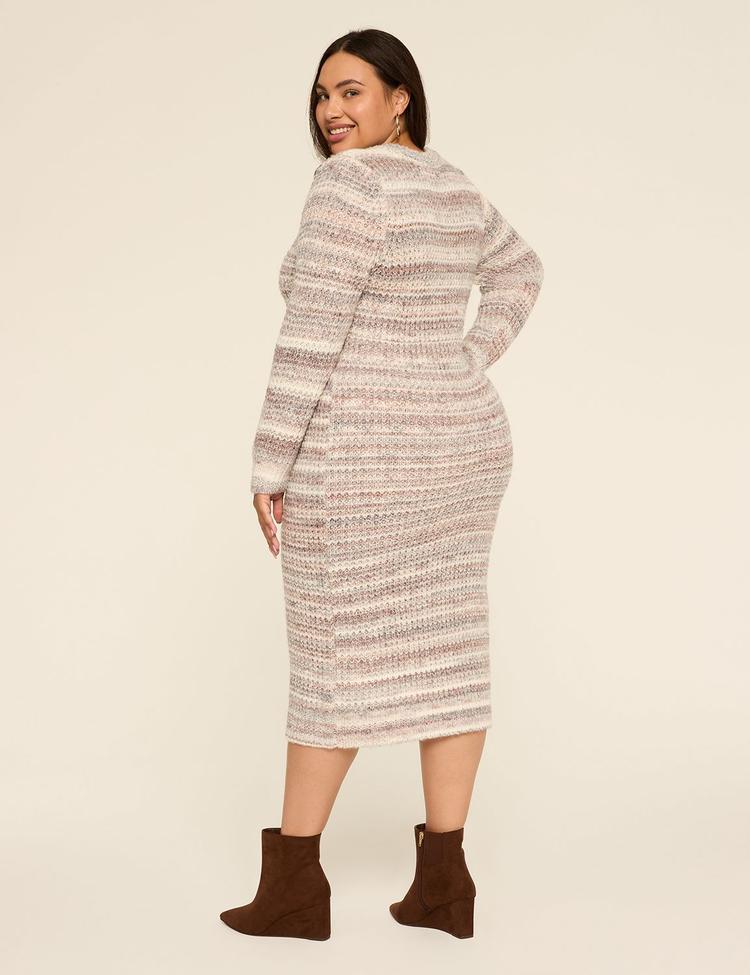 Soft knit fabric in a flattering fitted silhouette brings warmth and style to this plus size sweater dress. Featuring timeless dusty rose and mauve stripes on an off-white base, it offers a crew neckline and long sleeves finished with ribbed trim at the collar and cuffs. The midi length and cozy stretch knit make it ideal for autumn and winter days, perfect for casual outings, workwear, or elegant brunch dates. This dress combines comfort with classic charm to elevate your seasonal wardrobe effortlessly.