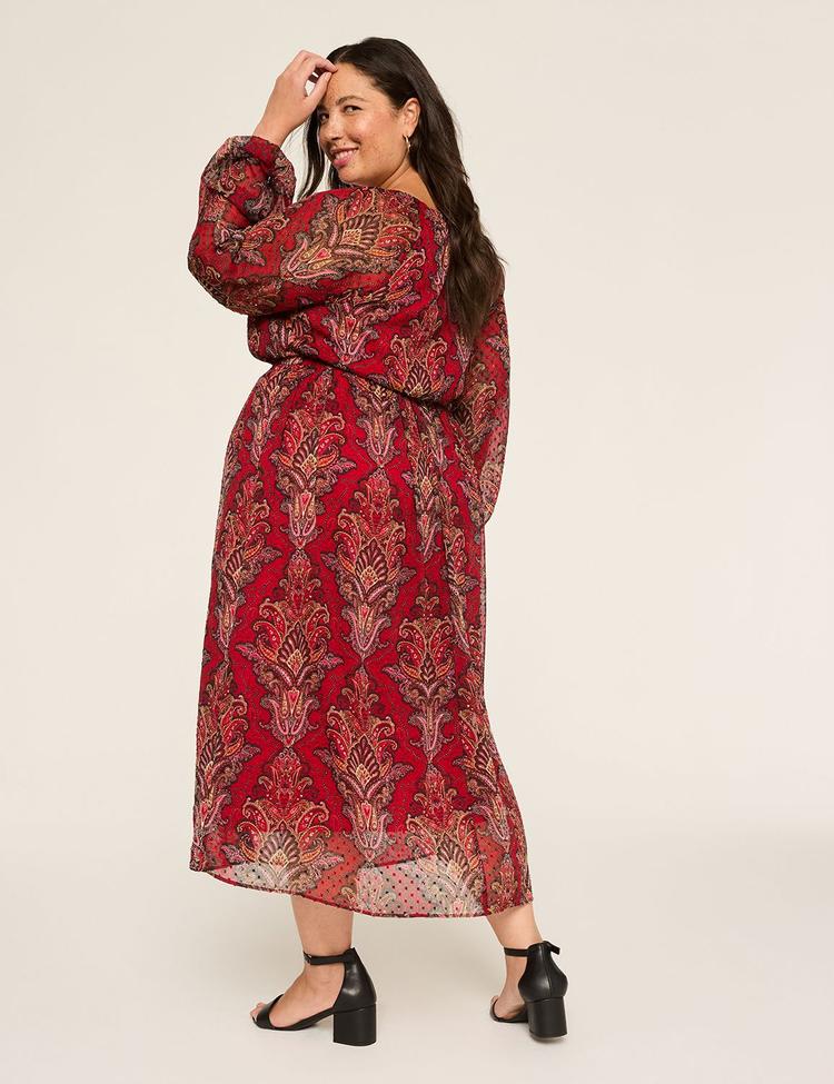 Available in Plus Size Pattern play is this dress in allover paisley, with soft elastic smocking for a comfy-yet-cinched fit. FIT: Fit & Flare. Universally flattering silhouette with a classic fit bodice, fitted waist and flared skirt. Front Length (On Body): 52" (hits mid to lower calf) Midi length FEATURES: Scoop neck Long sleeves Covered elastic waistband, neckline and cuffs Pockets Lined No closure, pull-over style FABRIC: Soft-textured, airy fabric Machine Wash Cold With Like Colors Gentle Cycle Only Non-Chlorine Bleach When Needed Tumble Dry Low Cool Iron If Needed 100% Polyester Item Number #413417 Imported Plus Size Dress ". Plus Size Long-Sleeve Scoop-Neck Midi Dress, in Red Paisley, 22, Women's, Lane Bryant