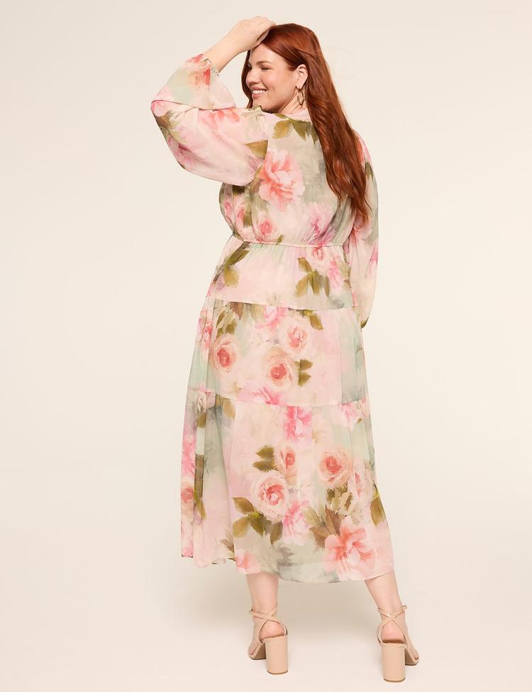 Soft polyester fabric and a fit and flare silhouette create an effortlessly elegant vibe in this plus size maxi dress. Featuring a romantic V-neck and long regular sleeves, the tiered layered skirt adds graceful movement to the midi hemline. Its all-over dusty pink and sage floral print on an off-white base makes it perfect for spring weddings, date nights, or brunch occasions. The fitted bodice and waist highlight a flattering shape while offering comfort and style for warmer seasons.