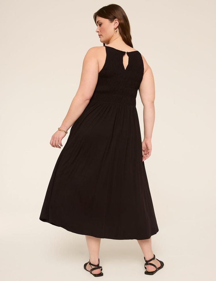 Soft fabric and a shirred bodice combine to create a flattering fit and flare silhouette in this plus size maxi sundress. The sleeveless high neckline and keyhole back offer subtle details, while the flared skirt reaches mid to lower calf for a breezy, comfortable fit. Ideal for casual outings, vacations, or relaxed brunches, this classic black dress pairs effortlessly with a denim jacket or shrug for cooler moments. Crafted from a rayon blend with elastane for stretch, it ensures easy wear and movement throughout warm spring and summer days.