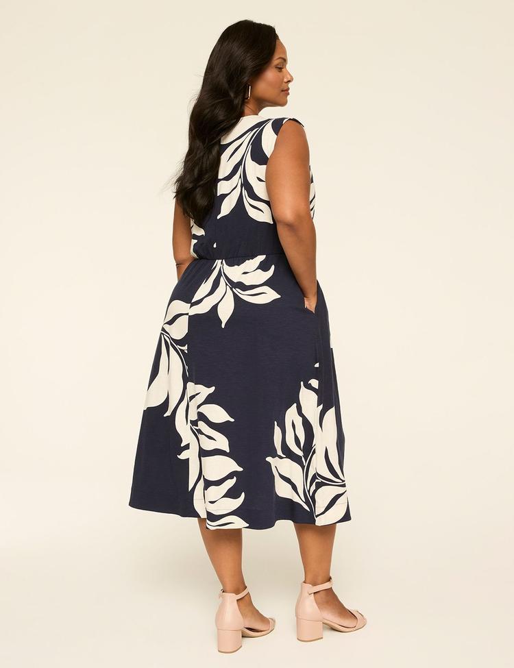 Soft cotton fabric and a flattering fit and flare silhouette come together in this sleeveless midi dress, featuring a bold floral print in matte dark blue and off-white. The V-neckline and flutter sleeves add a touch of femininity, while the tie-front detail at the waist enhances the fitted bodice. Practical pockets and a clean hemline complete the look, making it an ideal choice for casual outings, brunches, and date nights throughout the year. Designed in plus size, this versatile dress blends comfort and classic style effortlessly.