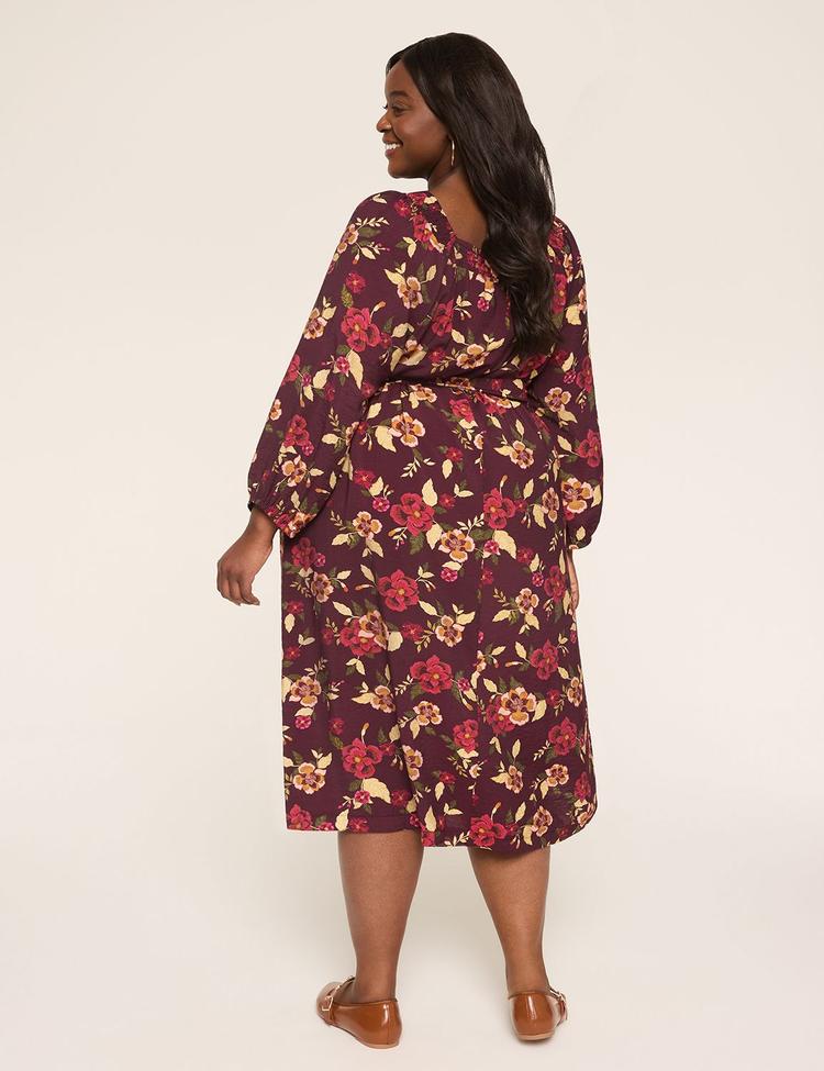 Soft smocking at the square neckline and a fit and flare silhouette define this plus size midi dress in rich maroon floral print. Crafted from breathable rayon and nylon, it features long sleeves with cuffed elastic and a matching self-tie belt to cinch the waist. The flattering midi length with pockets offers both style and comfort, making it perfect for casual brunches, daytime dates, or relaxed office settings. Effortless to wear with a slip-on design, this classic yet chic dress is ideal for transitional spring and autumn seasons.