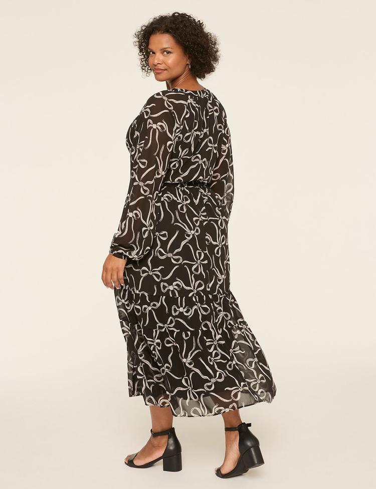 Soft chiffon fabric and a universally flattering fit and flare silhouette create a timeless appeal in this midi-length dress. Featuring a split neckline and long sleeves with covered elastic cuffs, the dress offers both comfort and style. The all-over abstract bow print in crisp white contrasts elegantly against the matte black base, complemented by a custom cinch tie at the waist to enhance the fitted bodice. Ideal for casual outings, workwear, or brunch dates, this plus-size piece balances classic elegance with versatile wearability.