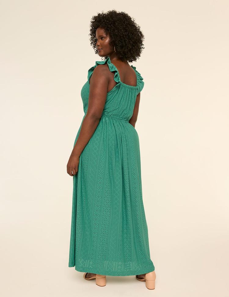 Soft polyester with a hint of stretch shapes this flattering fit and flare maxi dress in a serene matte green. The square neckline and delicate cap sleeves with ruffled eyelet embroidery add a touch of classic charm, while the lined bodice ensures comfort. Falling to a clean hem at mid to lower calf length, this plus size silhouette is perfect for casual outings, brunch dates, or travel days, offering versatile all-year wearability with easy care.